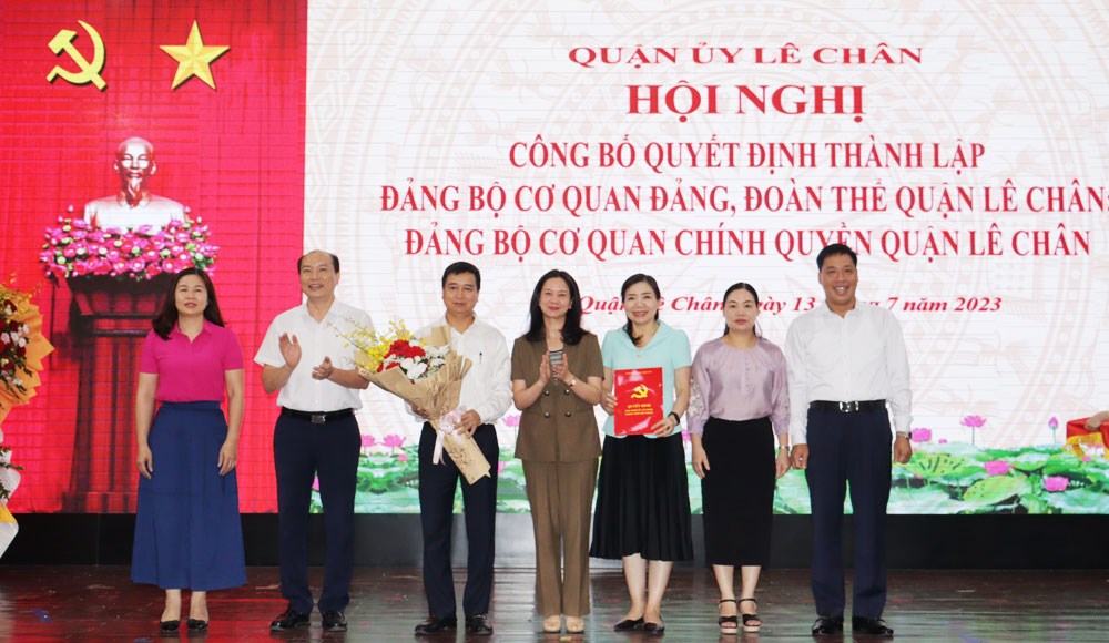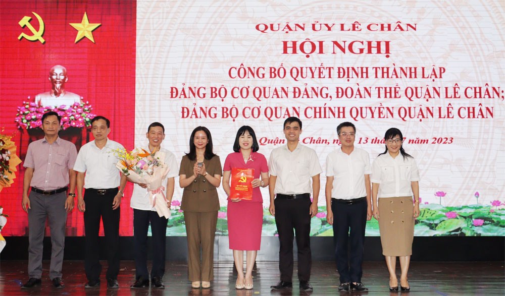 Hội nghị đã công bố các Quyết định thành lập Đảng bộ cơ quan Đảng, Đoàn thể quận Lê Chân; Đảng bộ cơ quan chính quyền quận Lê Chân. Theo đó, Đảng bộ Cơ quan Đảng, Đoàn thể quận Lê Chân gồm 50 đảng viên và chỉ định đồng chí Phạm Văn Tân, Phó Bí thư Thường trực Quận ủy, Chủ tịch HĐND quận giữ chức vụ Bí thư Đảng ủy; đồng chí Nguyễn Thị Minh Ngọc, Ủy viên Ban Thường vụ, Trưởng Ban Tuyên giáo Quận ủy, Giám đốc Trung tâm Chính trị quận giữ chức vụ Phó Bí thư Đảng ủy.