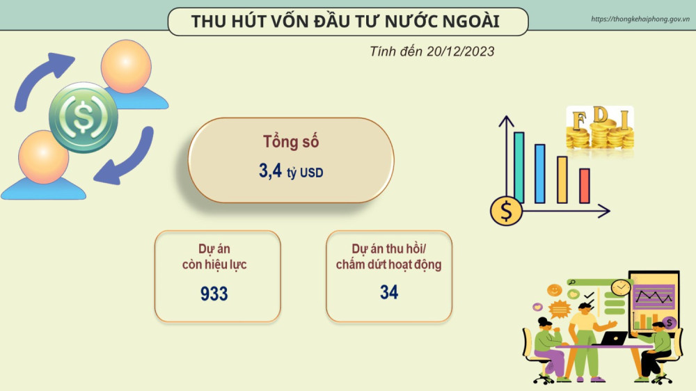 Năm 2023, vốn đầu tư thực hiện trên địa bàn thành phố năm 2023 ước đạt 190.641,7 tỷ đồng, tăng 11,24% so với cùng kỳ, trong đó, khu vực vốn nhà nước có mức tăng cao nhất, tăng 31,36%, chiếm cơ cấu 14,90%; khu vực ngoài nhà nước tăng 8,46%, đây là khu vực có đóng góp nhiều nhất trong mức tăng trưởng chung với cơ cấu chiếm 50,97%; khu vực vốn đầu tư nước ngoài tăng 8,15% so với cùng kỳ, chiếm cơ cấu 34,13%.Môi trường đầu tư kinh doanh của thành phố tiếp tục được cải thiện, hệ thống kết cấu hạ tầng ngày càng hoàn thiện, cùng với hiệu quả từ chuỗi các hoạt động xúc tiến đầu tư đã giúp Thành phố đạt kỷ lục về thu hút vốn đầu tư trực tiếp nước ngoài trong bối cảnh xu hướng đầu tư ra nước ngoài của các quốc gia phát triển có dấu hiệu chững lại, các quốc gia trong khu vực cũng có nhiều chính sách mới để cạnh tranh đón dòng vốn đầu tư dịch chuyển. Tính đến ngày 20/12/2023, Hải Phòng xếp thứ hai cả nước với tổng số vốn thu hút là 3,4 tỷ USD, có 933 dự án còn hiệu lực với tổng vốn đầu tư là 28,9 tỷ USD./.