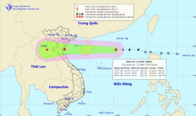Theo tin từ Trung tâm Dự báo khí tượng thủy văn Trung ương, hồi 13 giờ ngày 17/7/2018, vị trí tâm bão số 3 ở khoảng 19,4 độ Vĩ Bắc; 115,9 độ Kinh Đông, cách đảo Hải Nam khoảng 550km về phía Đông. Sức gió mạnh nhất vùng gần tâm bão mạnh cấp 8 (60-75km/giờ), giật cấp 10. Dự báo trong 24 giờ tới, bão di chuyển rất nhanh theo hướng Tây Tây Bắc, mỗi giờ đi được khoảng 35km, khoảng sáng mai (18/7) bão số 3 sẽ đi vào Vịnh Bắc Bộ. Đến 13 giờ ngày 18/7, vị trí tâm bão ở khoảng 19,5 độ Vĩ Bắc; 107,5 độ Kinh Đông, ngay trên vùng biển Vịnh Bắc Bộ, cách bờ biển các tỉnh từ Hải Phòng đến Hà Tĩnh khoảng 150-180km về phía Đông. Sức gió mạnh nhất vùng gần tâm bão mạnh cấp 8 (60-75km/giờ), giật cấp 10. Phạm vi gió mạnh cấp 6, giật cấp 8 trở lên khoảng 100km tính từ vùng tâm bão.