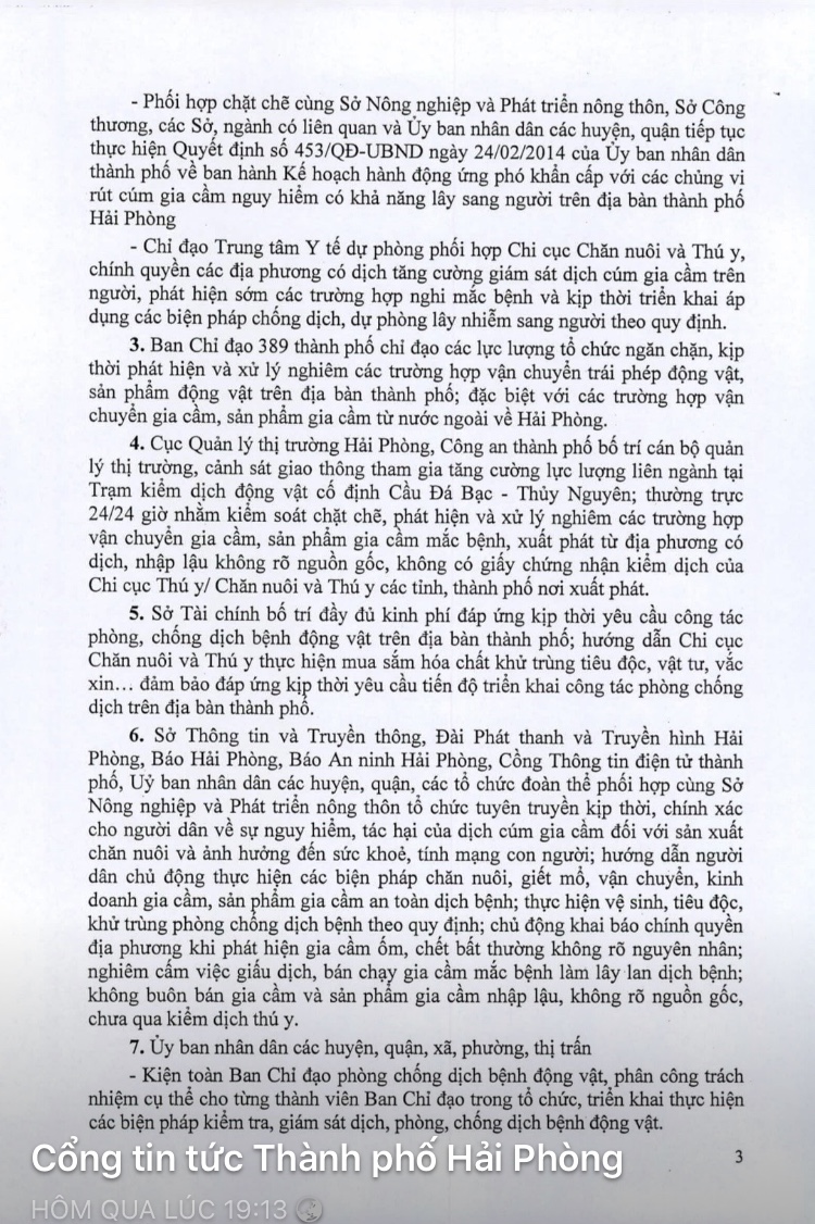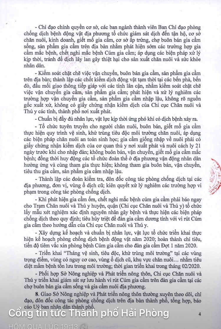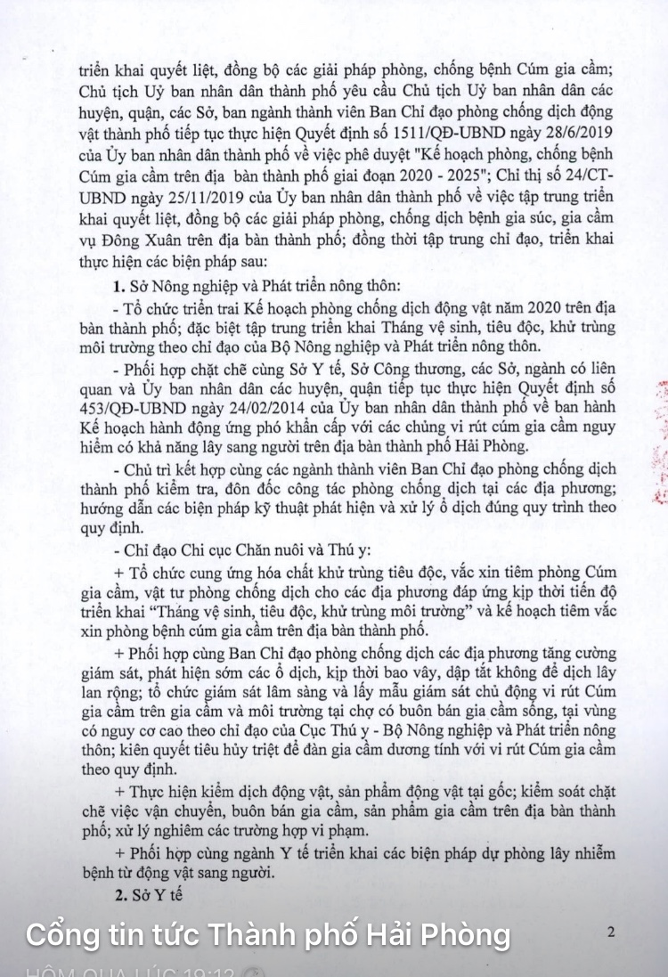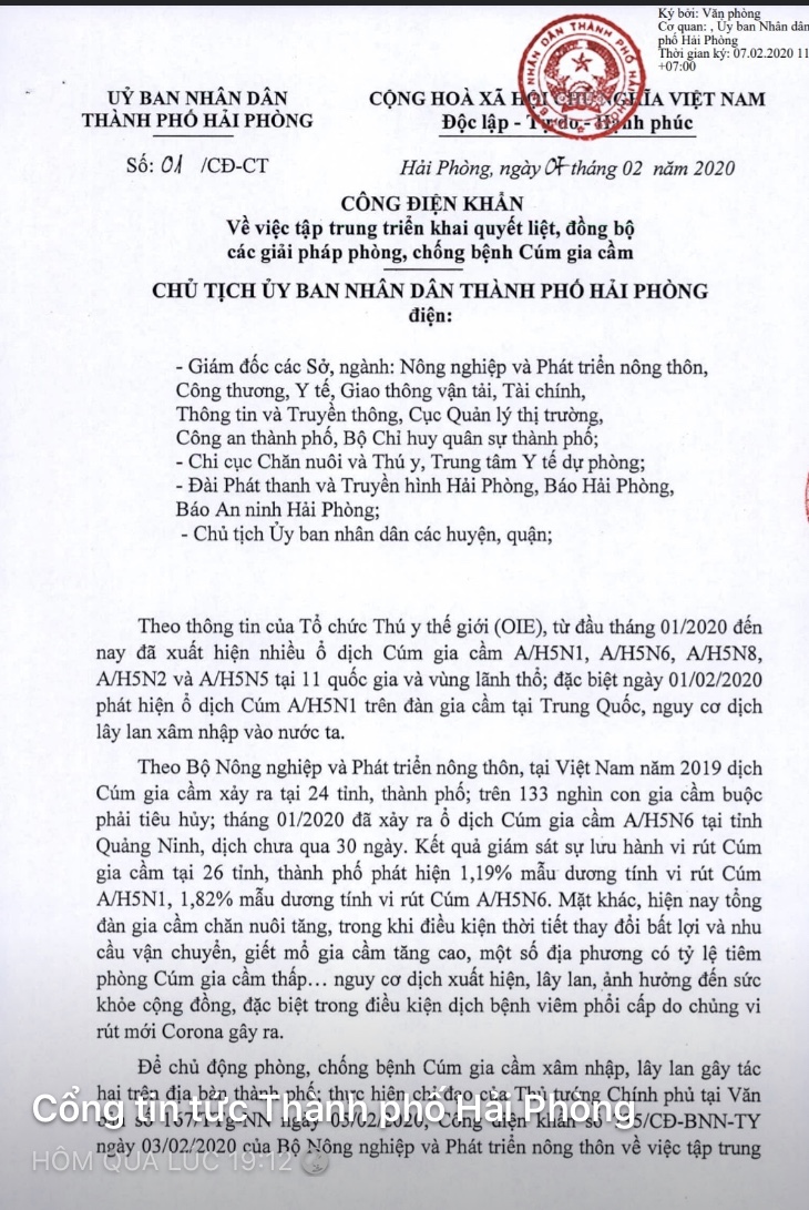 Để chủ động phòng, chống dịch Cúm gia cầm xâm nhập, lây lan gây tác hại trên địa bàn thành phố, Chủ tịch UBND thành phố vừa ra Công điện khẩn số 01/CĐ-CT về việc tập trung triển khai quyết liệt, đồng bộ các giải pháp phòng, chống bệnh Cúm gia cầm