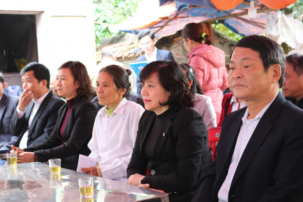 Lãnh đạo UBND huyện Vĩnh Bảo, BHXH thành phố, BHXH huyện dự lễ khởi công xây nhà tình nghĩa tặng bà Nguyễn Thị Phất (áo trắng)