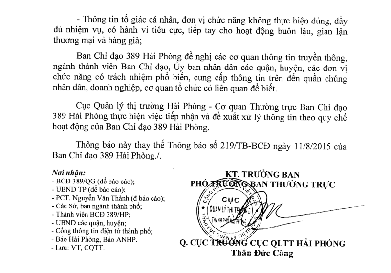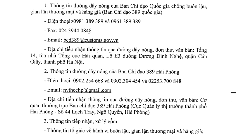 Ban chỉ đạo chống buôn lậu, gian lận thương mại và hàng giả thành phố Hải Phòng (Ban Chỉ đạo 389 Hải Phòng) thông báo việc tiếp nhận, xử lý thông tin tố giác về các hành vi buôn lậu, gian lận thương mại và hàng giả trên địa bàn thành phố Hải Phòng, để kịp thời tiếp nhận thông tin phản ánh và xử lý, ngăn chặn các hành vi trên qua thông tin đường dây nóng dưới đây:
