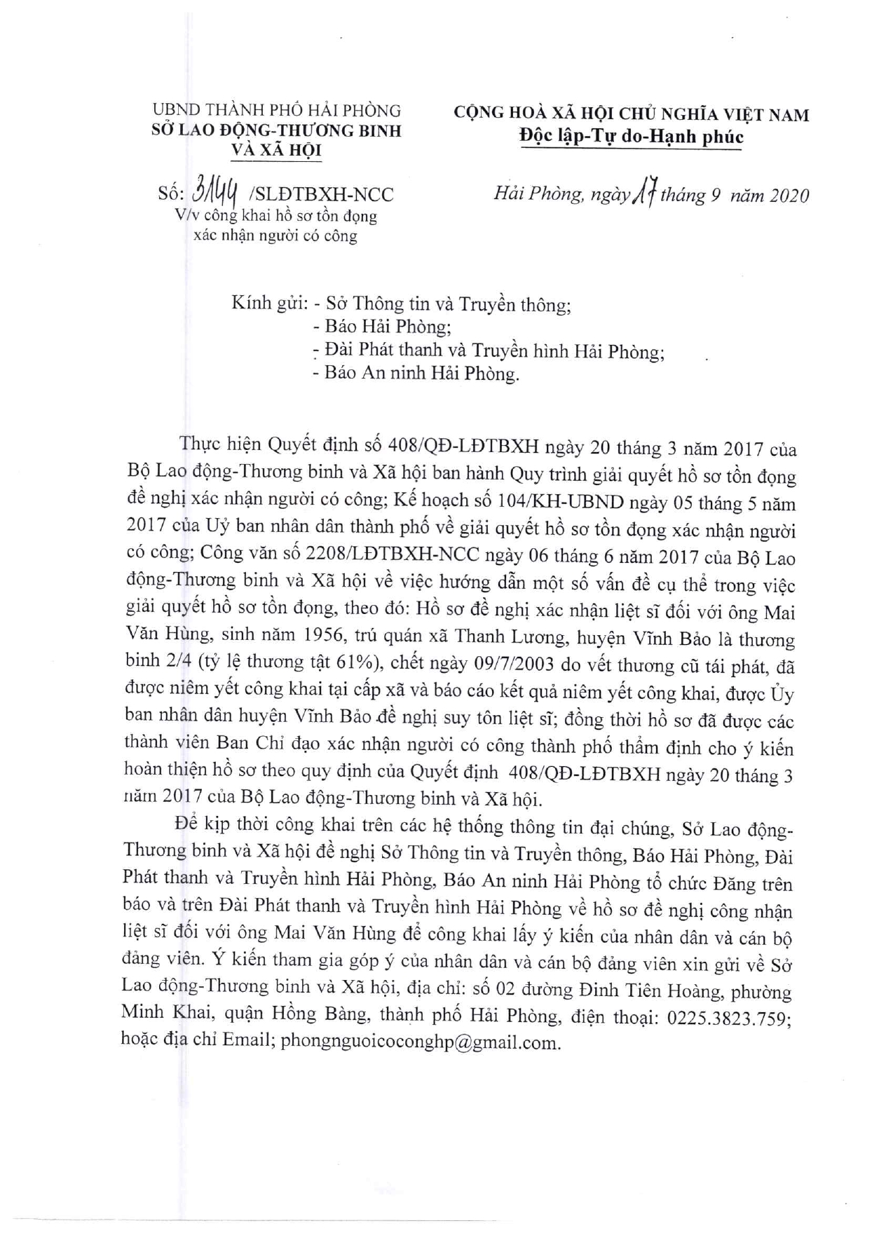Theo đó, để kịp thời công khai trên các hệ thống thông tin đại chúng, Sở Lao động-Thương binh và Xã hội đề nghị Sở Thông tin và Truyền thông, Báo Hải Phòng, Đài Phát thanh và Truyền hình Hải Phòng, Báo An ninh Hải Phòng tổ chức đăng trên báo và trên Đài Phát thanh và Truyền hình Hải Phòng về hồ sơ đề nghị công nhận liệt sĩ đối với ông Mai Văn Hùng để công khai lấy ý kiến của nhân dân và cán bộ đảng viên.