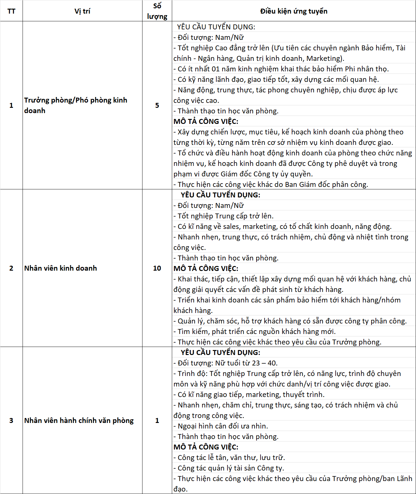 Với mục tiêu mở rộng hoạt động kinh doanh và phục vụ khách hàng ngày càng tốt hơn nữa, Bảo Minh Hải Phòng đang có nhu cầu tuyển dụng những ứng viên phù hợp vào các vị trí sau: