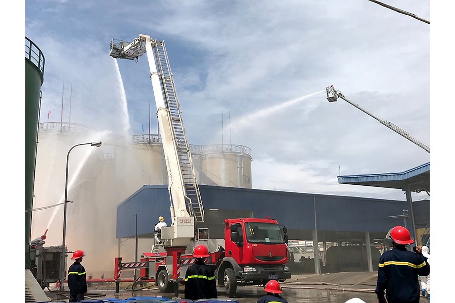 Tình huống giả định được đưa ra là vào hồi 9 giờ 20 phút ngày 12-6, xảy ra sự cố cháy tại mặt bích bồn chứa TO3 chứa hóa chất Methanol. Nguyên nhân do đường ống công nghệ bị sự cố dẫn đến rò rỉ hóa chất ra môi trường, gặp nguồn nhiệt gây cháy. Thời điểm xảy ra hỏa hoạn, khu vực này có khoảng 20 người làm việc; nhiều phương tiện giao thông ra vào xuất, nhập hàng.
