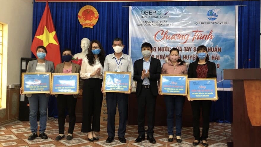 Nhằm chung tay, chia sẻ với nhân dân địa phương thực hiện tốt phòng chống dịch, sáng 20-3, Công ty CP Khu công nghiệp Đình Vũ thuộc Tổ hợp Khu công nghiệp DEEP C đã phối hợp với Hội Liên hiệp Phụ nữ huyện Cát Hải trao 1.920 chai rửa tay khô sát khuẩn tới 5 xã, thị trấn thuộc huyện đảo, trị giá gần 60 triệu đồng.