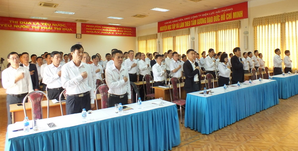 Lãnh đạo và nhân viên Công ty Điện lực Hải Phòng đọc lời tuyên thề thực hiện 5 điều trong văn hóa lao động