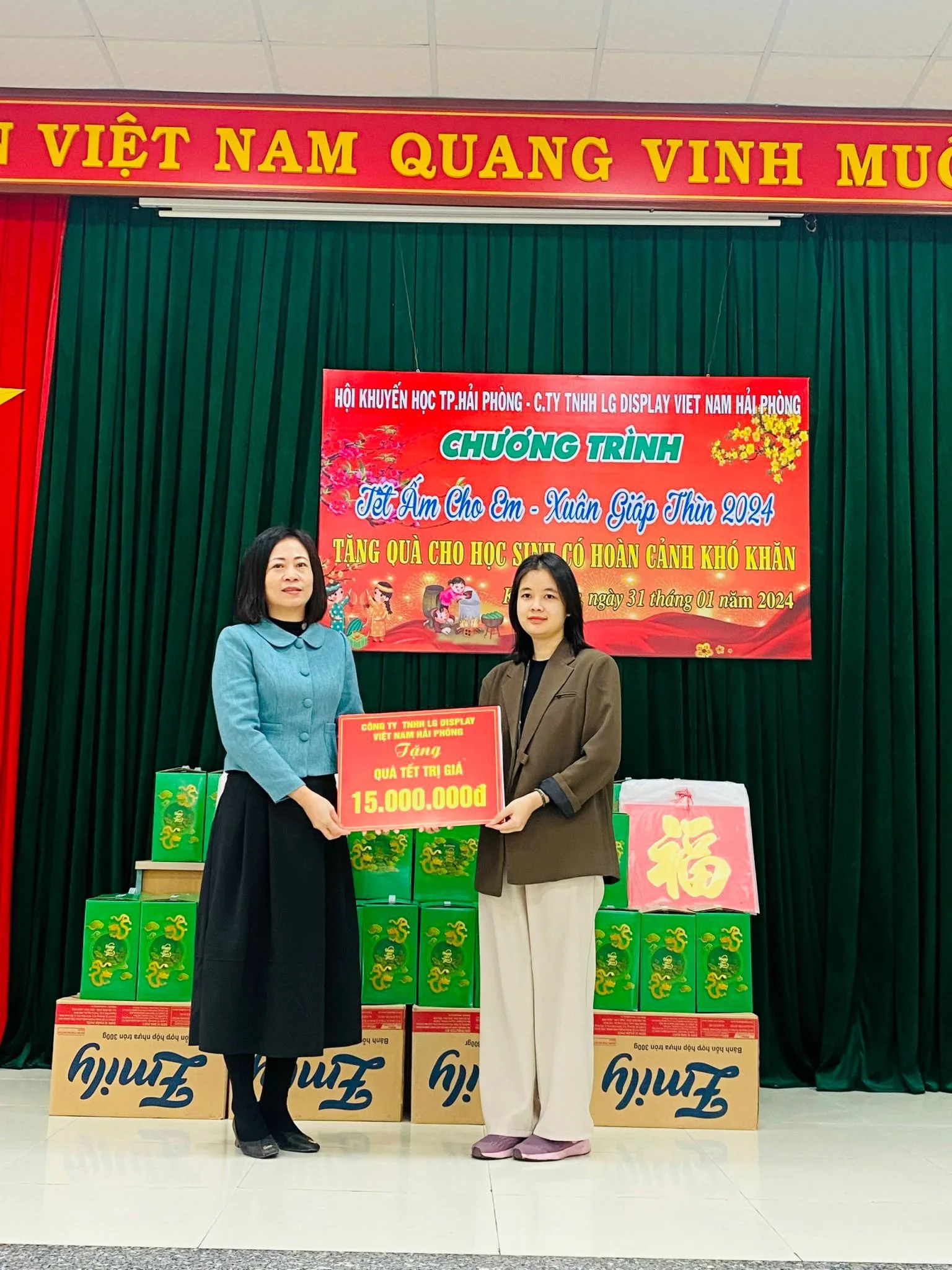 Sáng ngày 31/01 vừa qua, Công ty TNHH LG Display Việt Nam Hải Phòng phối hợp với Hội Khuyến học Hải Phòng tổ chức chương trình “Tết ấm cho em – Xuân Giáp Thìn 2024” tại huyện Kiến Thụy. Công ty đã trao 50 suất quà Tết, trị giá 15.000.000 đồng cho các em học sinh có hoàn cảnh khó khăn trên địa bàn huyện Kiến Thụy.
