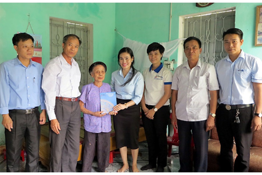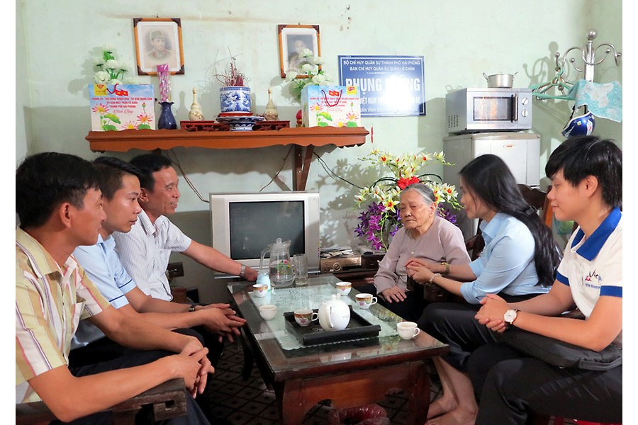 Đại diện Công ty Xi măng vicem Hải Phòng đến thăm, tặng quà Mẹ Việt Nam anh hùng Trần Thị Cõn, xã Vĩnh Long, huyện Vĩnh Bảo có chồng và con duy nhất là liệt sĩ. Ảnh Văn Lượng