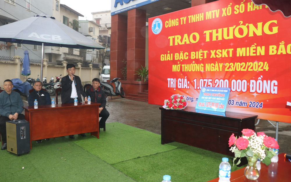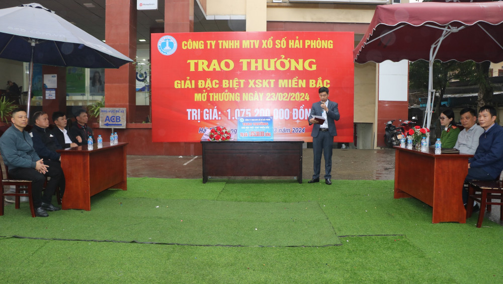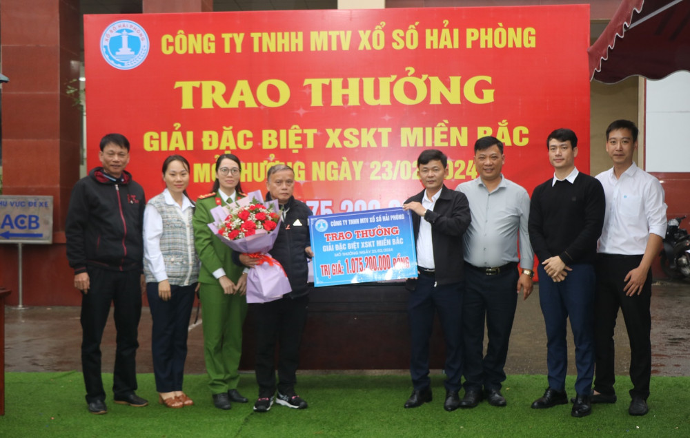Chiều 4/3, Công ty TNHH MTV Xổ số Hải Phòng tổ chức Lễ trao thưởng giải Đặc biệt Xổ số Kiến thiết miền Bắc mở thưởng ngày 23/2/2024 cho khách hành may mắn trúng 2 vé giải Đặc biệt, 3 vé giải phụ với tổng giá trị giải thưởng là 1.075.200.000 đồng.