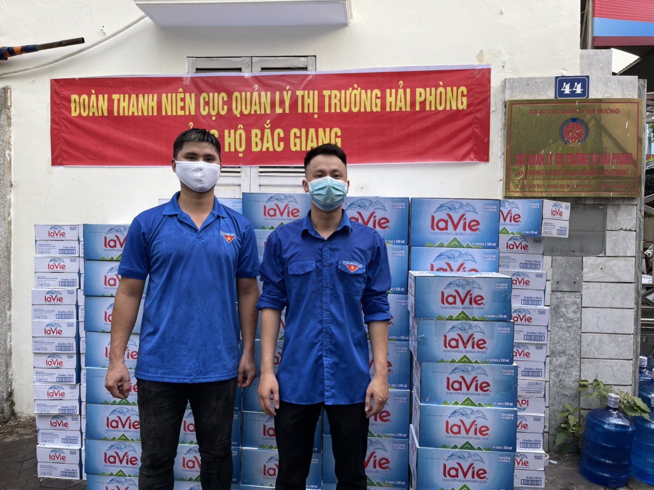Cũng trong chiều ngày 25/5/2021, được sự đồng ý của lãnh đạo Cục QLTT thành phố Hải Phòng, Đoàn thanh niên Cục QLTT thành phố Hải Phòng với phương châm hành động “Đâu cần thanh niên có, đâu khó có thanh niên” đã trao gửi hơn 400 thùng nước uống và hơn 4000 khẩu trang y tế đến vùng tâm dịch Bắc Giang.