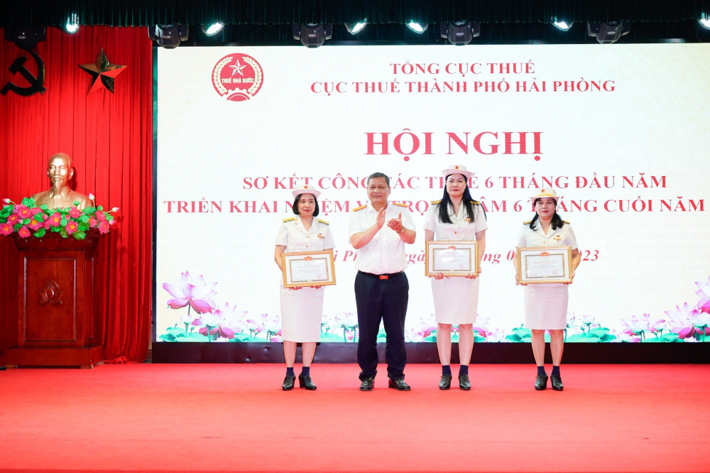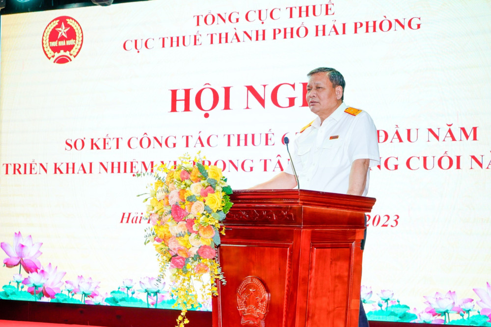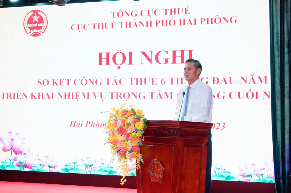 Phát biểu chỉ đạo tại Hội nghị, đồng chí Phi Vân Tuấn, Phó Tổng cục Trưởng Tổng cục Thuế chúc mừng kết quả phát triển kinh tế-xã hội thành phố Hải Phòng đạt được trong 6 tháng đầu năm 2023 và là một trong 03 địa phương dẫn đầu trong cả nước về phát triển kinh tế. Đồng chí đề nghị Cục Thuế Hải Phòng tiếp tục đánh giá, rà soát tình hình nguồn thu trong điều kiện tình hình giảm các sắc thuế, phân tích rõ từng nguồn thu, đặc biệt là thuế bảo vệ môi trường, thuế VAT, bên cạnh đó phải tìm kiếm nguồn thu. Cùng với đó đẩy mạnh công tác tuyên truyền, chú trọng tuyên truyền sâu rộng việc sai phạm của người nộp thuế để kịp thời ngăn chặn hành vi vi phạm pháp luật của người nộp thuế; công khai đơn vị nợ đọng thuế, tạo sự khách quan, công bằng, minh bạch. Tăng cường công tác chuyển đổi số, tích cực tham gia đóng góp ý kiến vào các văn bản, quy trình do Tổng cục Thuế xây dựng… và nỗ lực phấn đấu hoàn thành các chỉ tiêu dự toán Trung ương cùng HĐND thành phố giao năm 2023.