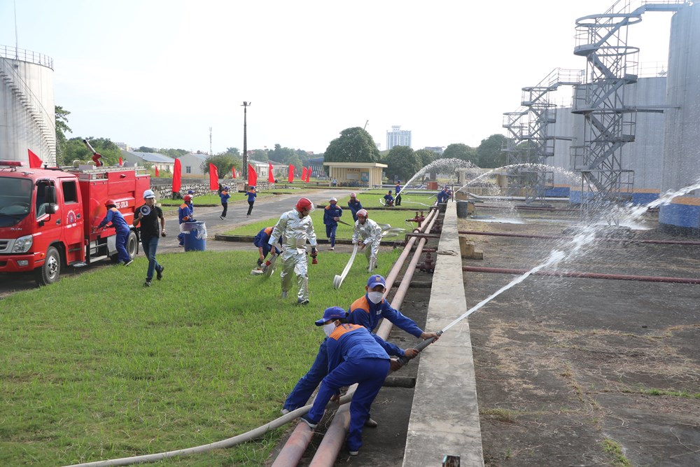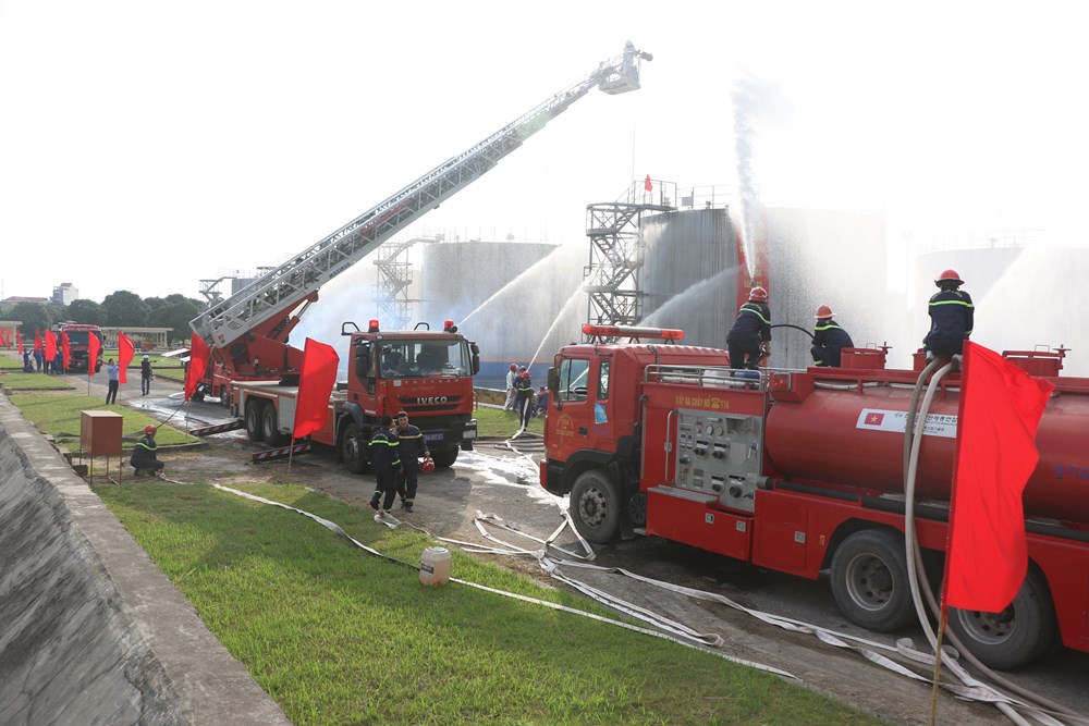 Các đội PCCC và CNCH cơ sở thuộc Cụm doanh nghiệp an toàn PCCC Sở Dầu đã thực tập tình huống giả định xảy ra cháy tại bể B3 dung tích 1.000m³ chứa xăng A95 đang nhập hàng do thiết bị bay từ ngoài kho lên mái bể và gây cháy bằng thiết bị điều khiển từ xa. Theo đó, ở giai đoạn đầu các đội PCCC và CNCH cơ sở Cụm doanh nghiệp an toàn PCCC Sở Dầu triển khai các tổ công tác như đã được thực tập PCCC và CNCH, ứng phó sự cố tràn dầu và chữa cháy ban đầu. Đồng thời các đội PCCC và CNCH cơ sở triển khai phương pháp cách ly và biện pháp chữa cháy theo diện tích, sử dụng chất chữa cháy là bọt để khống chế và dập tắt đám cháy theo hướng Đông Bắc của đám cháy.