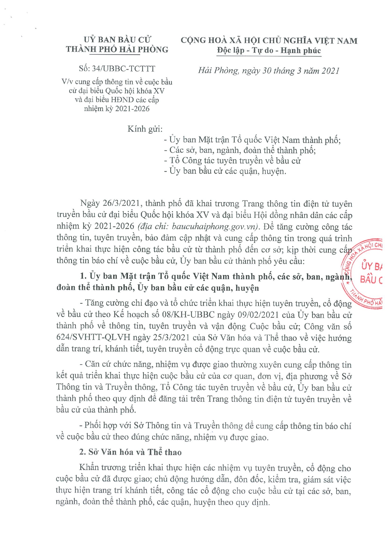 Sở Văn hóa và Thể thao khẩn trương triển khai thực hiện các nhiệm vụ tuyên truyền, cổ động cho cuộc bầu cử đã được giao; chủ động hướng dẫn, đôn đốc, kiểm tra, giám sát việc thực hiện trang trí khánh tiết, công tác cổ động cho cuộc bầu cử tại các sở, ban, ngành, đoàn thể thành phố, các quận, huyện theo quy định.