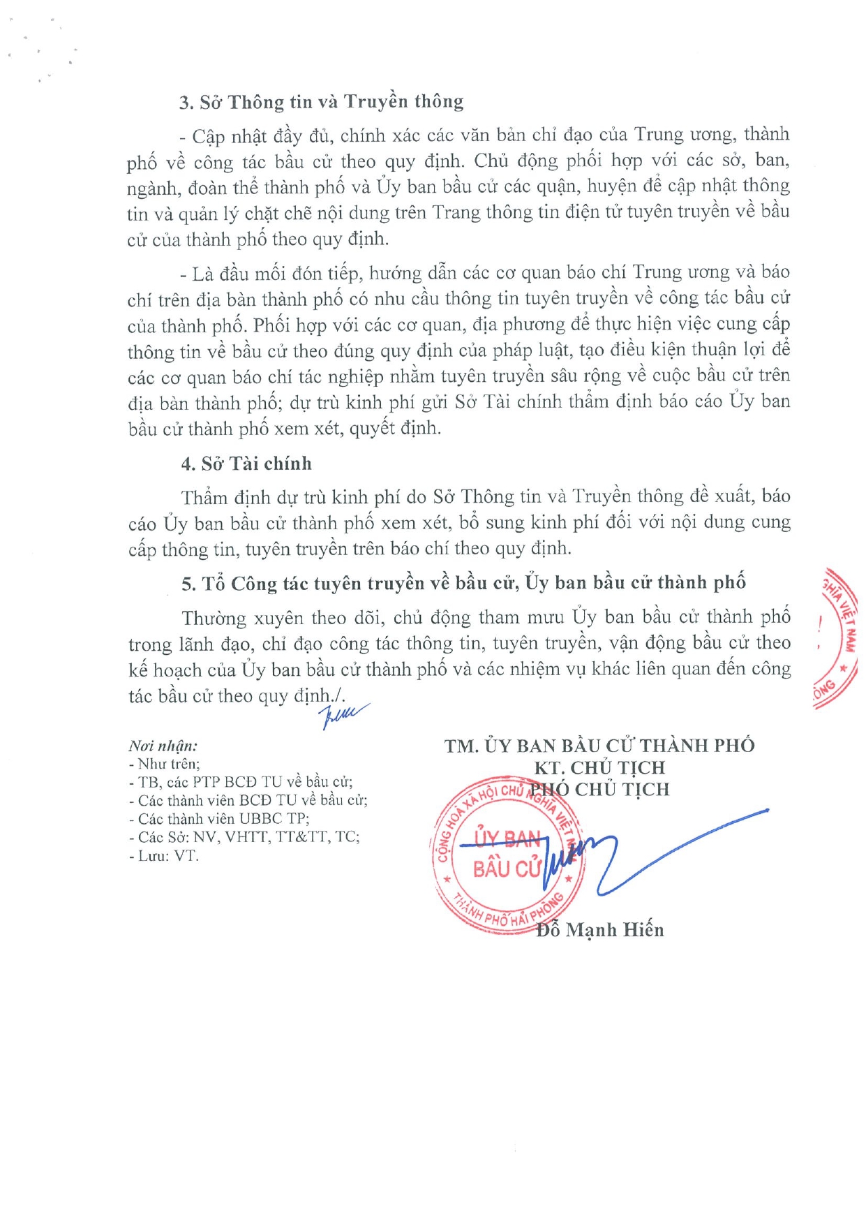 Sở Thông tin và Truyền thông cập nhật đầy đủ, chính xác các văn bản chỉ đạo của Trung ương, thành phố về công tác bầu cử theo quy định. Chủ động phối hợp với các sở, ban, ngành, đoàn thể thành phố và Ủy ban bầu cử các quận, huyện để cập nhật thông tin và quản lý chặt chẽ nội dung trên Trang thông tin điện tử tuyên truyền về bầu cử của thành phố theo quy định. Đồng thời, là đầu mối đón tiếp, hướng dẫn các cơ quan báo chí Trung ương và báo chí trên địa bàn thành phố có nhu cầu thông tin tuyên truyền về công tác bầu cử của thành phố. Phối hợp với các cơ quan, địa phương để thực hiện việc cung cấp thông tin về bầu cử theo đúng quy định của pháp luật, tạo điều kiện thuận lợi để các cơ quan báo chí tác nghiệp nhằm tuyên truyền sâu rộng về cuộc bầu cử trên địa bàn thành phố; dự trù kinh phí gửi Sở Tài chính thẩm định báo cáo Ủy ban bầu cử thành phố xem xét, quyết định.