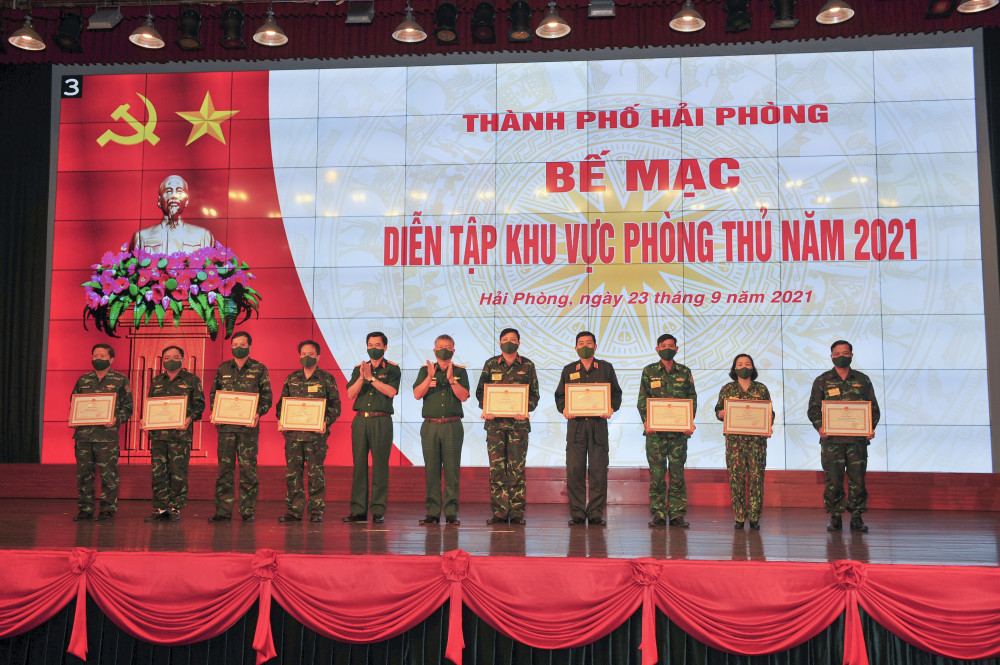 Nhân dịp này, Bộ Tư lệnh Quân khu Ba trao Bằng khen tặng 9 tập thể; UBND thành phố trao Bằng khen tặng 15 tập thể có thành tích xuất sắc trong tham gia diễn tập khu vực phòng thủ thành phố Hải Phòng năm 2021.
