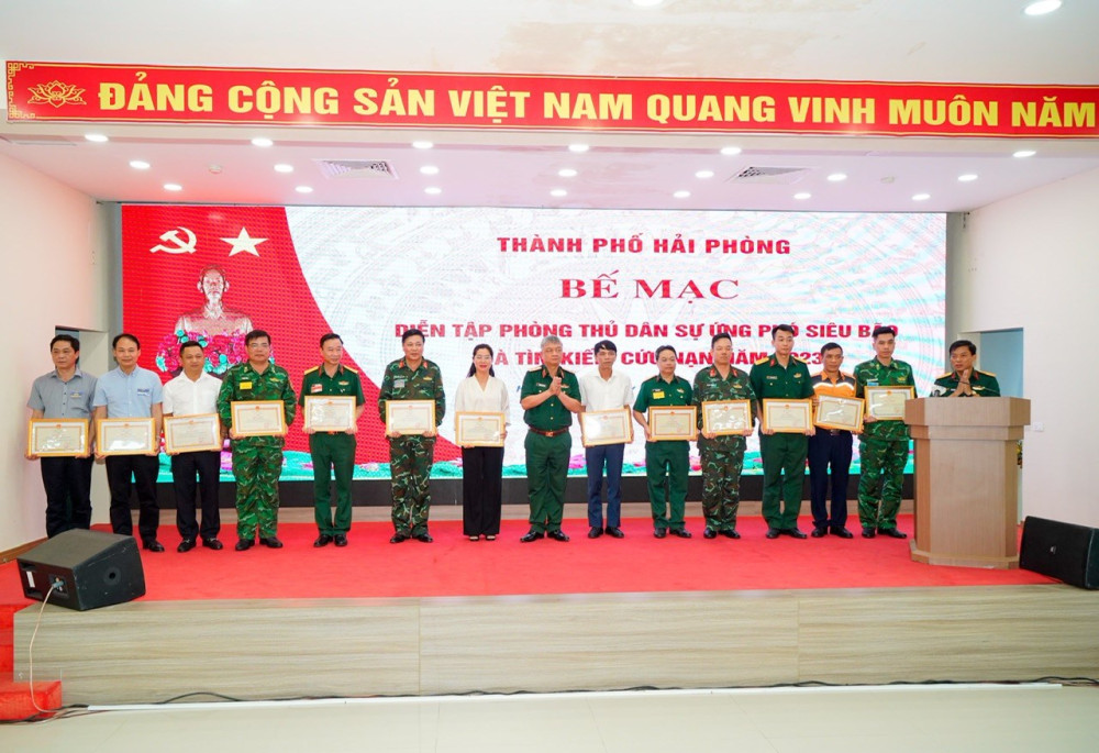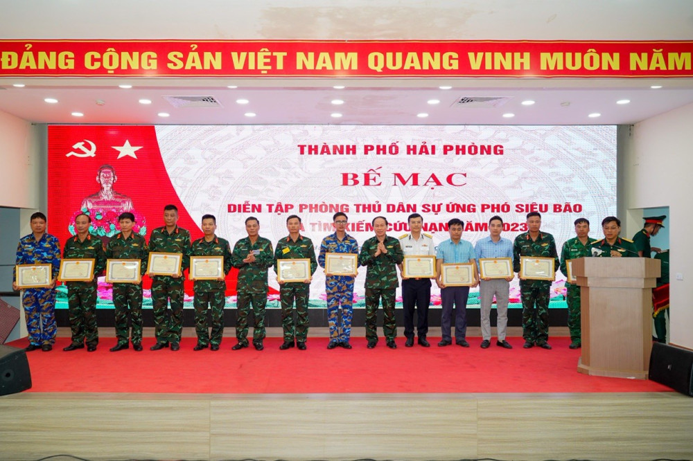 Nhân dịp này, Bộ Tư lệnh Quân khu 3, UBND thành phố trao Bằng khen cho các tập thể và cá nhân có thành tích xuất sắc trong công tác tổ chức diễn tập khu vực Phòng thủ dân sự ứng phó siêu bão và tìm kiếm cứu nạn thành phố Hải Phòng năm 2023.