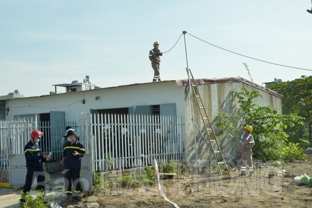 Công nhân Công ty Điện lực xử lý hệ thống dây điện hỗ trợ công tác cưỡng chế.