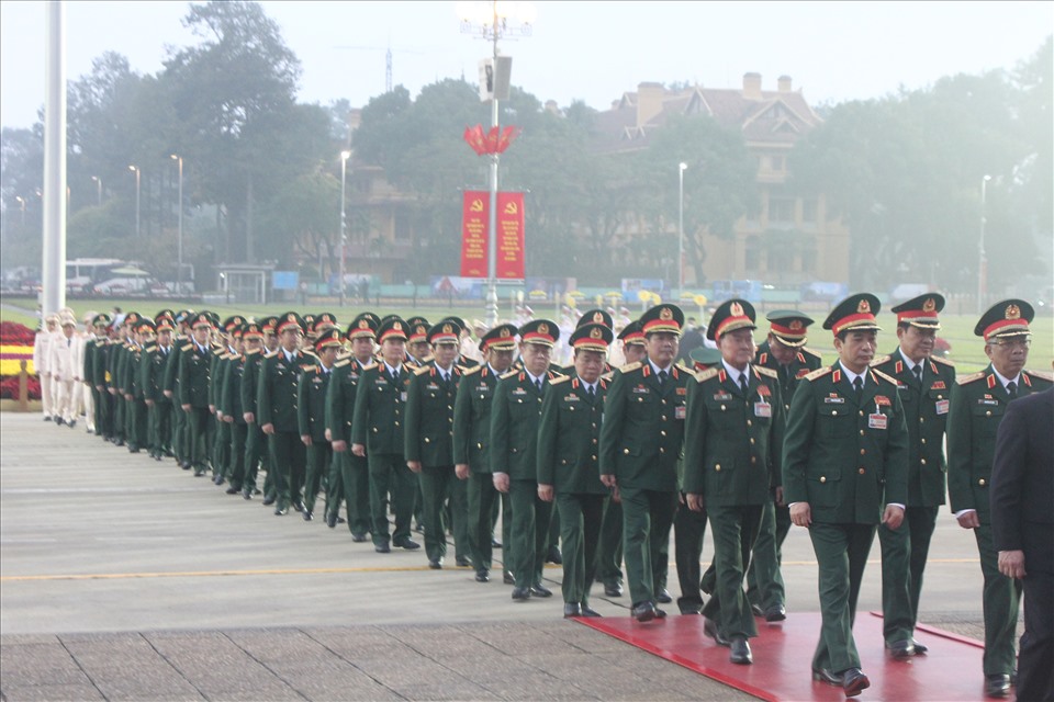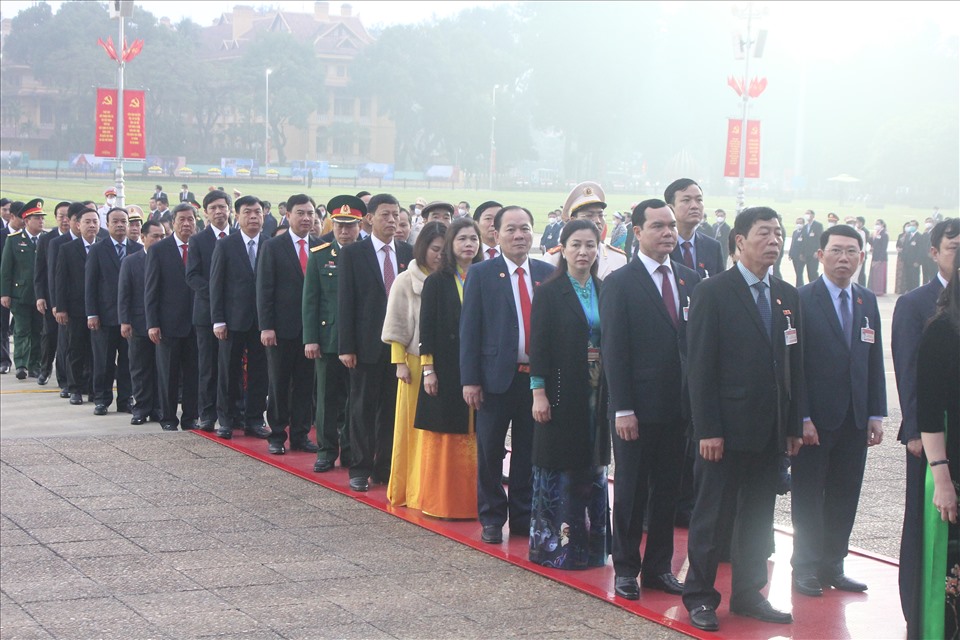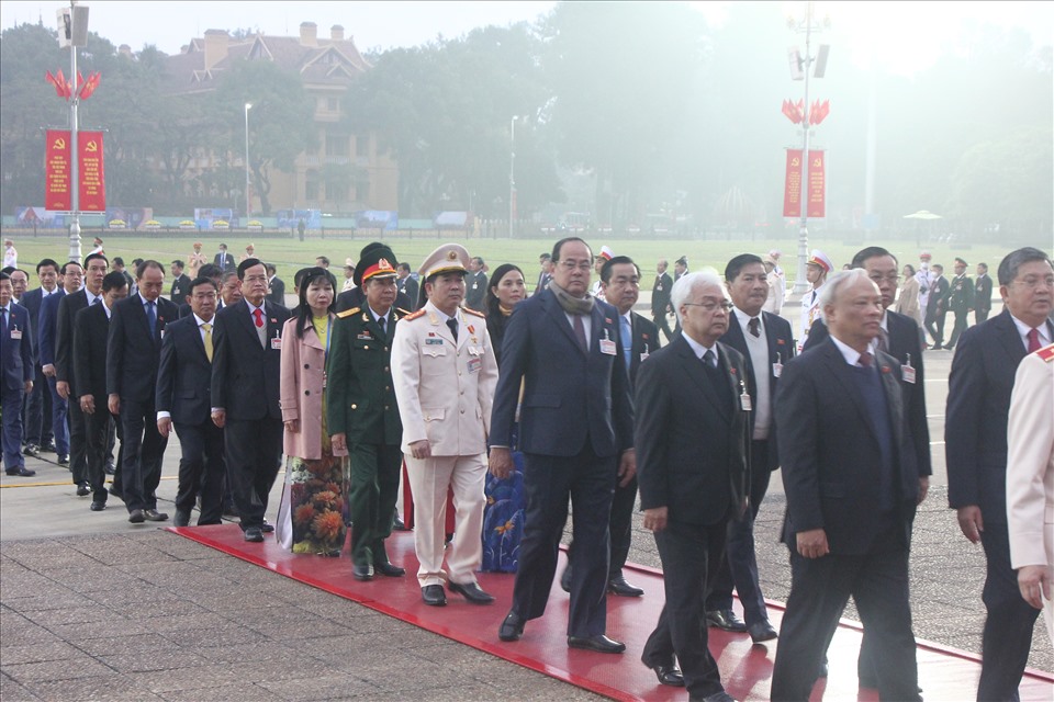 Trước giờ bắt đầu phiên trù bị, các đại biểu dự Đại hội Đại biểu toàn quốc lần thứ XIII của Đảng đã đặt hoa, vào Lăng viếng Chủ tịch Hồ Chí Minh.