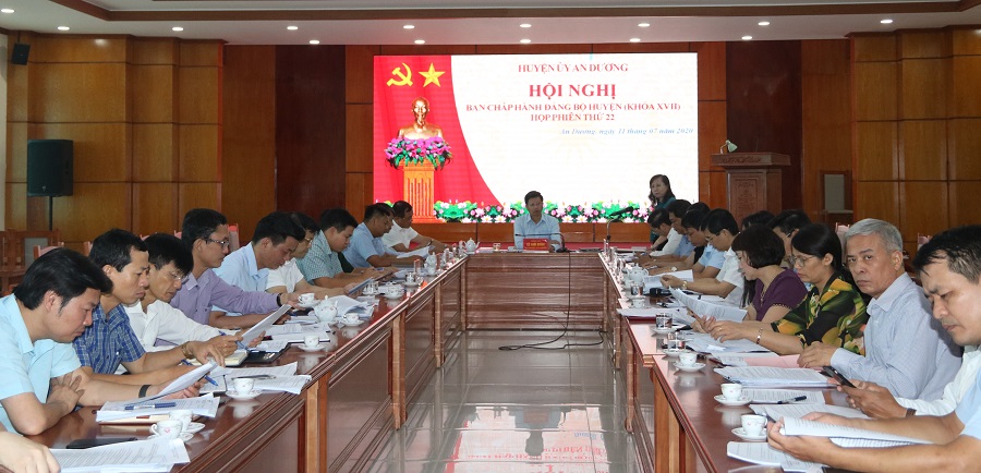 Sáng 11-7, Huyện ủy An Dương tổ chức Hội nghị Ban chấp hành Đảng bộ huyện (khóa XVII) họp phiên thứ 22 cho ý kiến vào các nội dung chuẩn bị Đại hội Đảng bộ huyện lần thứ XVIII nhiệm kỳ 2020-2025. Đồng chí Lê Anh Quân – Ủy viên Thành ủy, Bí thư Huyện ủy, Chủ tịch UBND huyện chủ trì hội nghị.