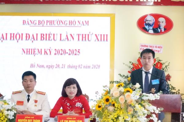 Phát biểu chỉ đạo đại hội, đồng chí Phạm Văn Tân – Phó Bí thư thường trực Quận ủy, Chủ tịch HĐND quận ghi nhận, biểu dương Đảng bộ phường Hồ Nam đã xuất sắc hoàn thành nhiệm vụ chỉ tiêu kinh tế, xã hội, quốc phòng, an ninh trong nhiệm kỳ vừa qua. Ghi nhận một số nhiệm vụ đã được Đảng bộ phường tập trung lãnh đạo, chỉ đạo đạt kết quả cao như công tác trật tự đường hè, vệ sinh môi trường, thực hiện tốt Nghị quyết 05 của HĐND thành phố về cải tạo ngõ, ngách và đổ bê tông tuyến đường gom dân sinh dọc đường sắt đi qua địa bàn phường; đời sống vật chất tinh thần của nhân dân được nâng cao, thực hiện thành công các biện pháp giảm nghèo bền vững, đến cuối năm 2019 trên địa bàn phường không còn hộ nghèo.