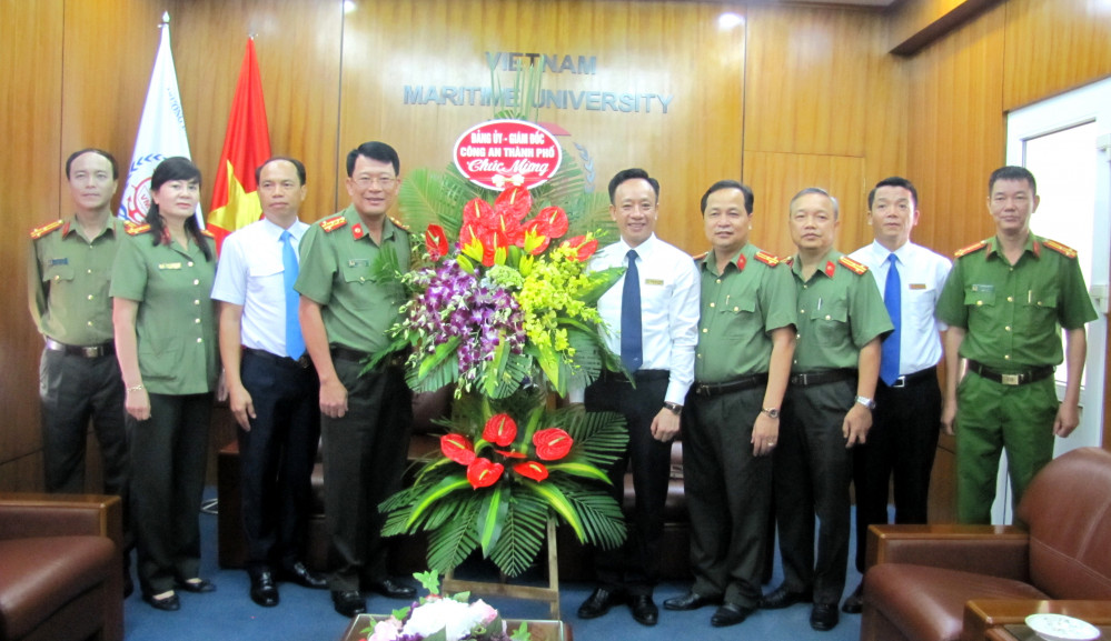 Đại tá Đào Quang Trường – Phó Giám đốc CATP cùng đoàn công tác tặng hoa Trường Đại học Hàng hải