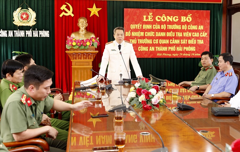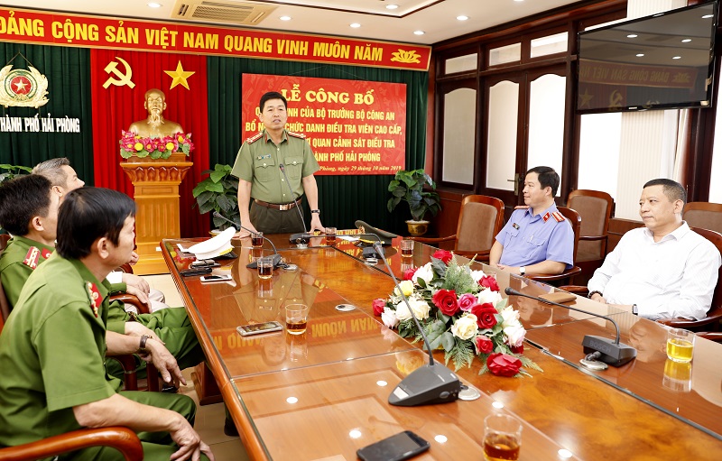 Buổi lễ đã công bố các quyết định của Bộ trưởng Bộ Công an về việc bổ nhiệm chức danh Điều tra viên cao cấp và Thủ trưởng Cơ quan CSĐT – CATP Hải Phòng đối với Đại tá Lê Nguyên Trường, Phó giám đốc CATP.