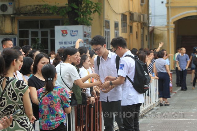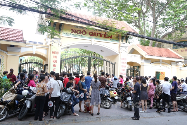 Khi thí sinh đã làm bài thi, nhiều phụ huynh vẫn tập trung bên ngoài Hội đồng thi trường THPT Ngô Quyền