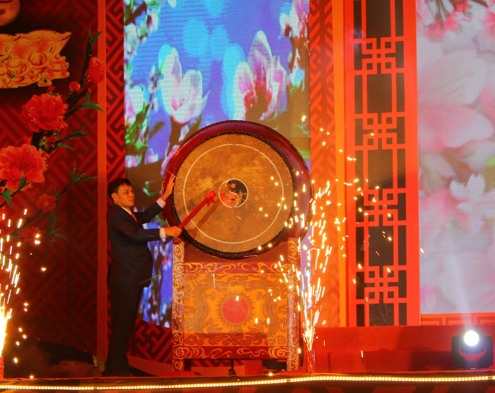 Đồng chí Nguyễn Văn Tùng, Chủ tịch UBND TP thực hiện nghi lễ đánh trống