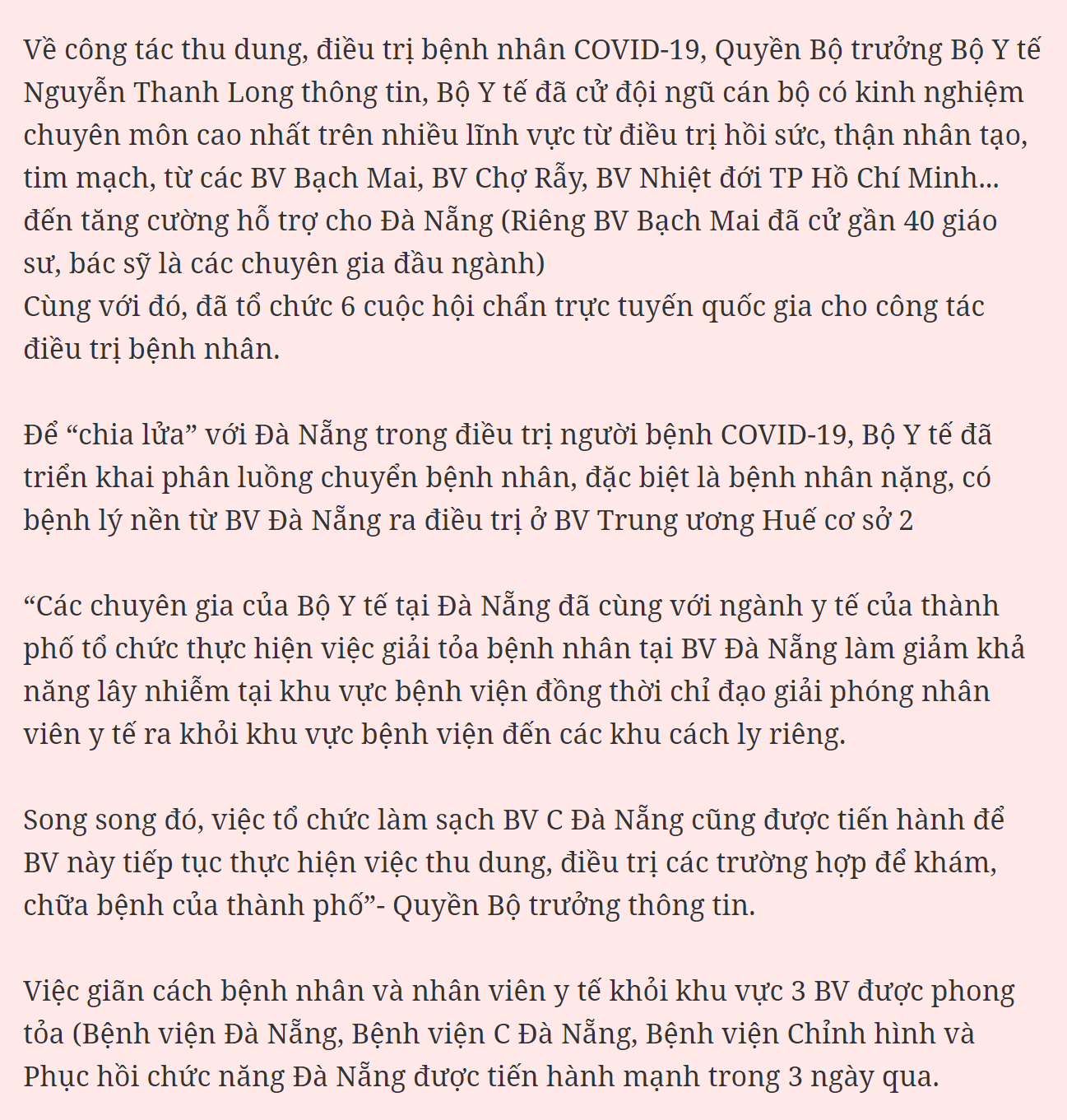 8 bệnh nhân nặng, nguy kịch khác đang điều trị tại Bệnh viện Đà Nẵng (hiện ở bệnh viện này điều trị 27 bệnh nhân COVID-19), Bệnh viện Phổi Đà Nẵng, Bệnh viện Bệnh Nhiệt đới TP Hồ Chí Minh và Bệnh viện Đa khoa Trung ương Quảng Nam.