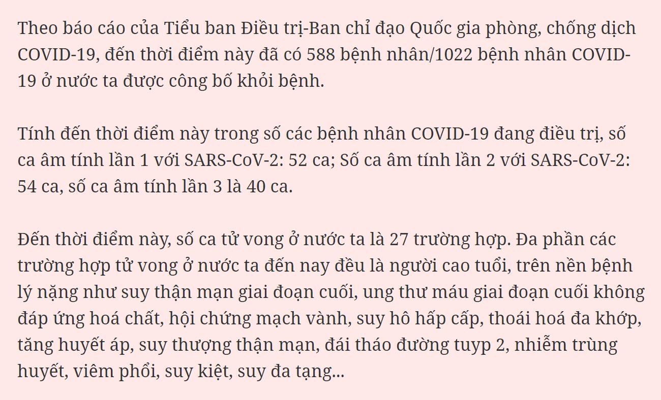 Hiện trong số 406 bệnh nhân COVID-19 đang điều trị tại các cơ sở y tế có 30 trường hợp tiên lượng nặng. Trong số này có 15 bệnh nhân rất nặng, nhiều trường hợp có nguy cơ tử vong cao.