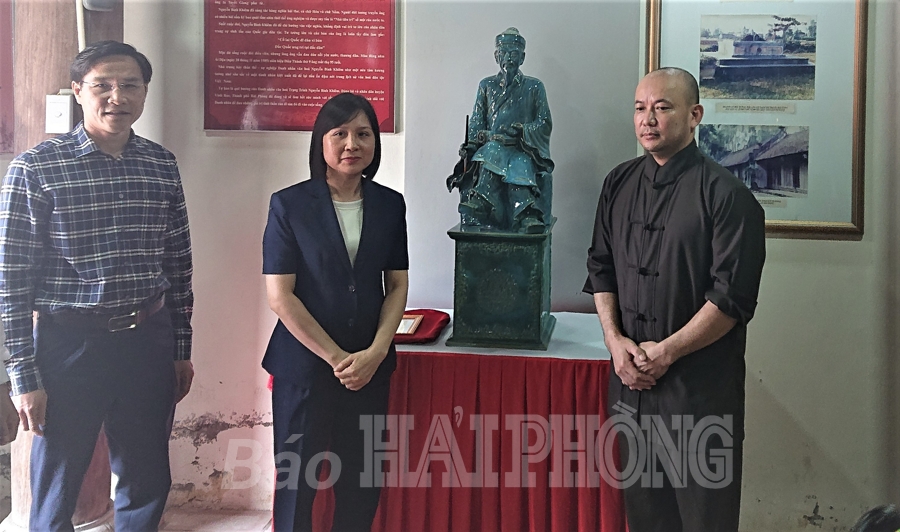 Dịp này, huyện Vĩnh Bảo đón nhận bức tượng Trạng Trình Nguyễn Bỉnh Khiêm bằng gốm men xanh cao 1m do đại đức Thích Chánh Tịnh trao tặng./.