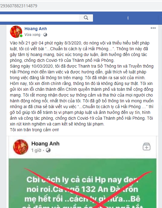 Sau khi được Thanh tra sở phân tích, giải thích pháp luật, Hoàng Anh đã nhận thức rõ và thừa nhận về hành vi đăng tải bài viết của mình là không có căn cứ, sai sự thật, vi phạm các quy định của pháp luật; gây tâm lý hoang mang, bức xúc trong dư luận, ảnh hưởng đến công tác phòng, chống dịch Covid-19 của thành phố Hải Phòng. Đồng thời bày tỏ sự hối hận, không lường trước được hậu quả của hành vi tung tin đồn thất thiệt kia.