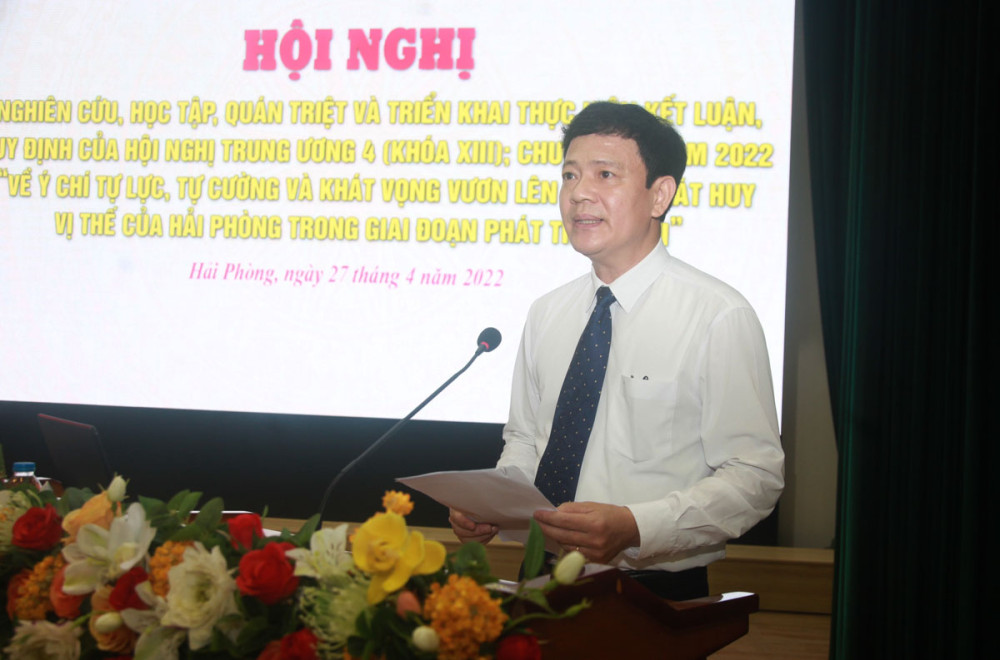 Đồng chí Bí thư Đảng ủy Khối Doanh nghiệp thành phố nhấn mạnh: Để thực hiện tốt những nhiệm vụ trên đòi hỏi mỗi cán bộ, đảng viên nhận thức phải chín, tư tưởng phải thông, quyết tâm phải lớn và có phương pháp đúng đắn, linh hoạt để lãnh đạo, chỉ đạo, tổ chức thực hiện. Đồng thời tin tưởng với quyết tâm chính trị cao của toàn Đảng bộ, cùng với sự tin tưởng, đồng tình, ủng hộ của các cán bộ, đảng viên, người lao động, Đảng bộ Khối Doanh nghiệp thành phố sẽ thực hiện hiệu quả Kết luận, Quy định của Hội nghị Trung ương 4 (khoá XIII) gắn với thực hiện Chuyên đề năm 2022 “về ý chí tự lực, tự cường và khát vọng vươn lên nhằm phát huy vị thế của Hải Phòng trong giai đoạn phát triển mới”, góp phần tạo bước chuyển biến mới trong công tác xây dựng, chỉnh đốn Đảng nói chung và xây dựng Đảng bộ Khối Doanh nghiệp ngày càng trong sạch, vững mạnh toàn diện.