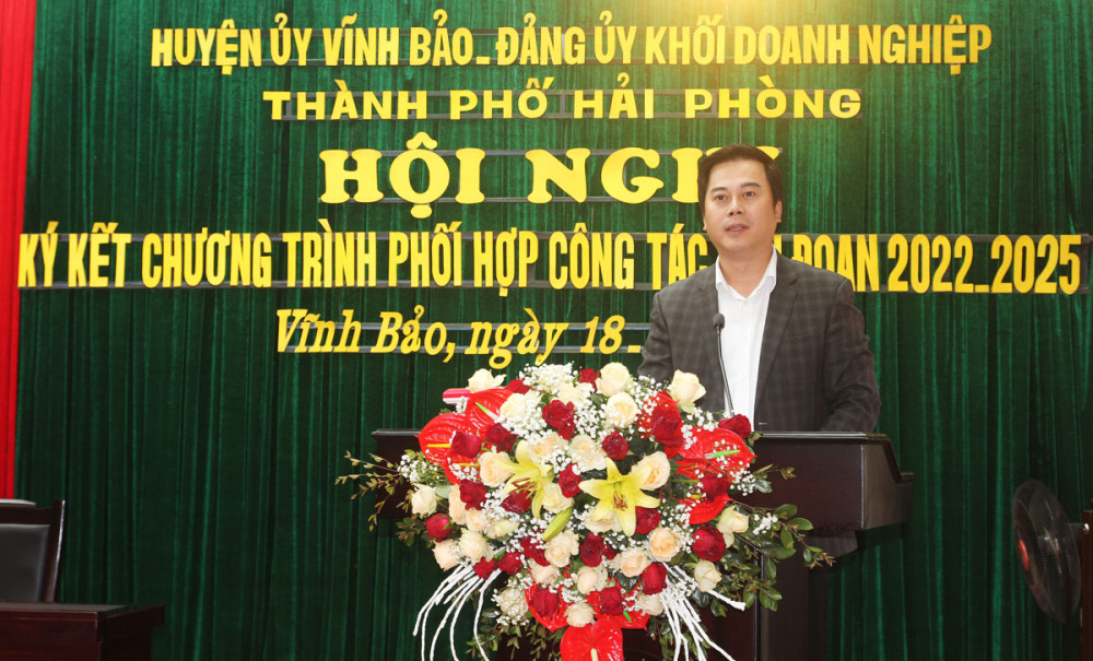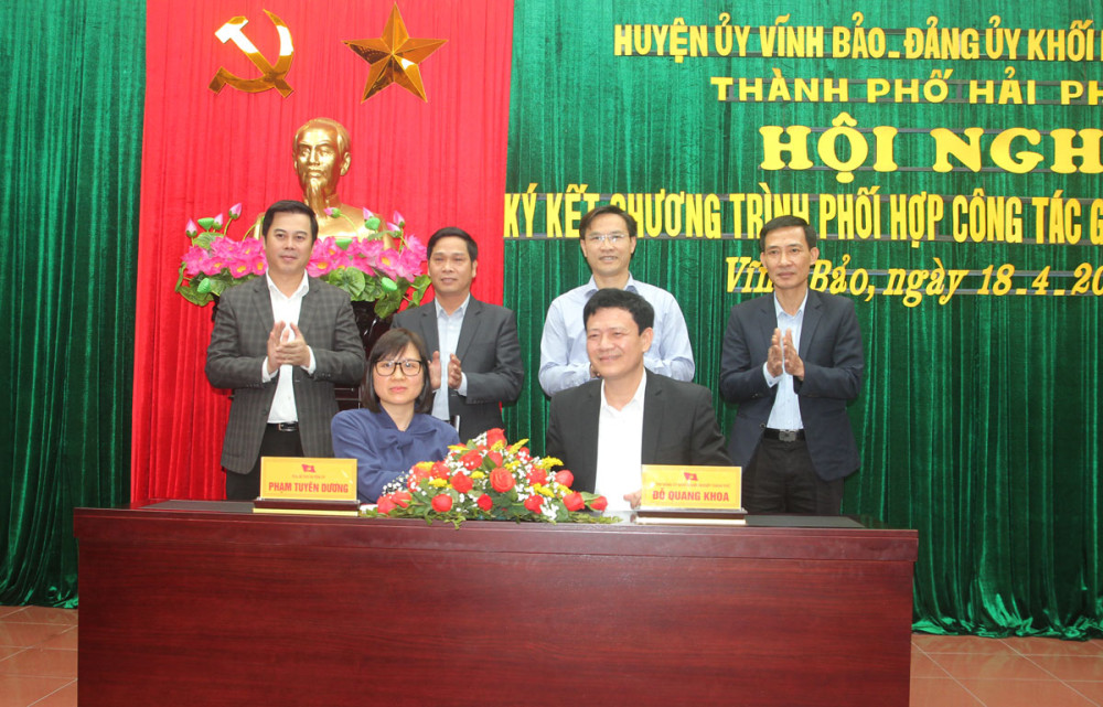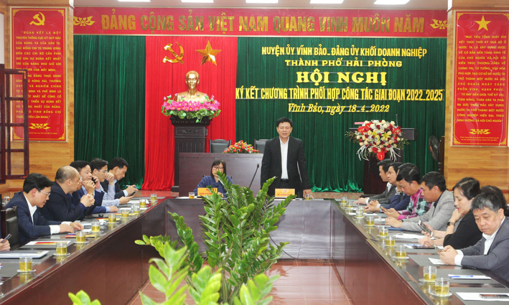 Ban Thường vụ Đảng ủy Khối Doanh nghiệp thành phố và Ban Thường vụ Huyện ủy Vĩnh Bảo thống nhất ký kết Chương trình phối hợp công tác giai đoạn 2022-2025 gồm 5 nội dung phối hợp, theo đó: Phối hợp trong công tác lãnh đạo các tổ chức đảng trực thuộc Khối hoạt động trên địa bàn huyện chấp hành, thực hiện nghị quyết của Thành ủy, Huyện ủy, HĐND, UBND huyện Vĩnh Bảo liên quan đến doanh nghiệp về phát triển kinh tế-xã hội, quản lý, sử dụng tài nguyên-đất đai, trật tự xây dựng, bảo vệ môi trường, công tác bảo đảm quốc phòng, an ninh,…