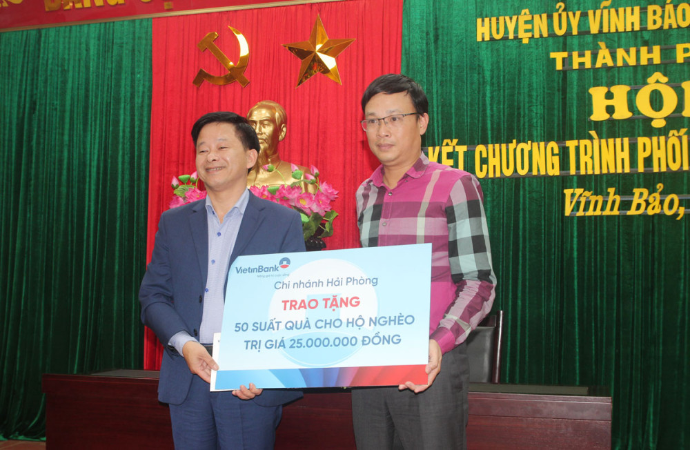 Tại Hội nghị, Ngân hàng Vietinbank chi nhánh Hải Phòng đã trao 50 suất quà trị giá 25 triệu đồng tặng hộ nghèo trên địa bàn huyện Vĩnh Bảo.