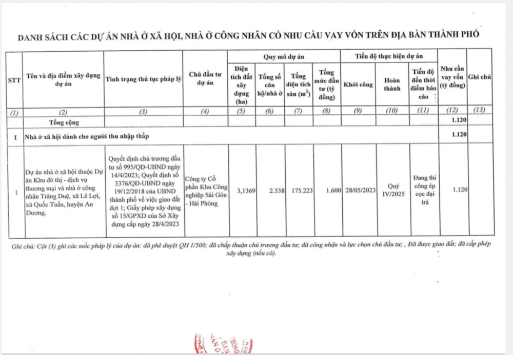 Danh mục Dự án Nhà ở xã hội, nhà ở công nhân (Nhà ở xã hội tại Khu công nghiệp) có nhu cầu vay vốn trên địa bàn thành phố (Đợt 2), đủ điều kiện theo quy định có nhu cầu vay vốn theo chương trình tín dụng 120.000 tỷ đồng: