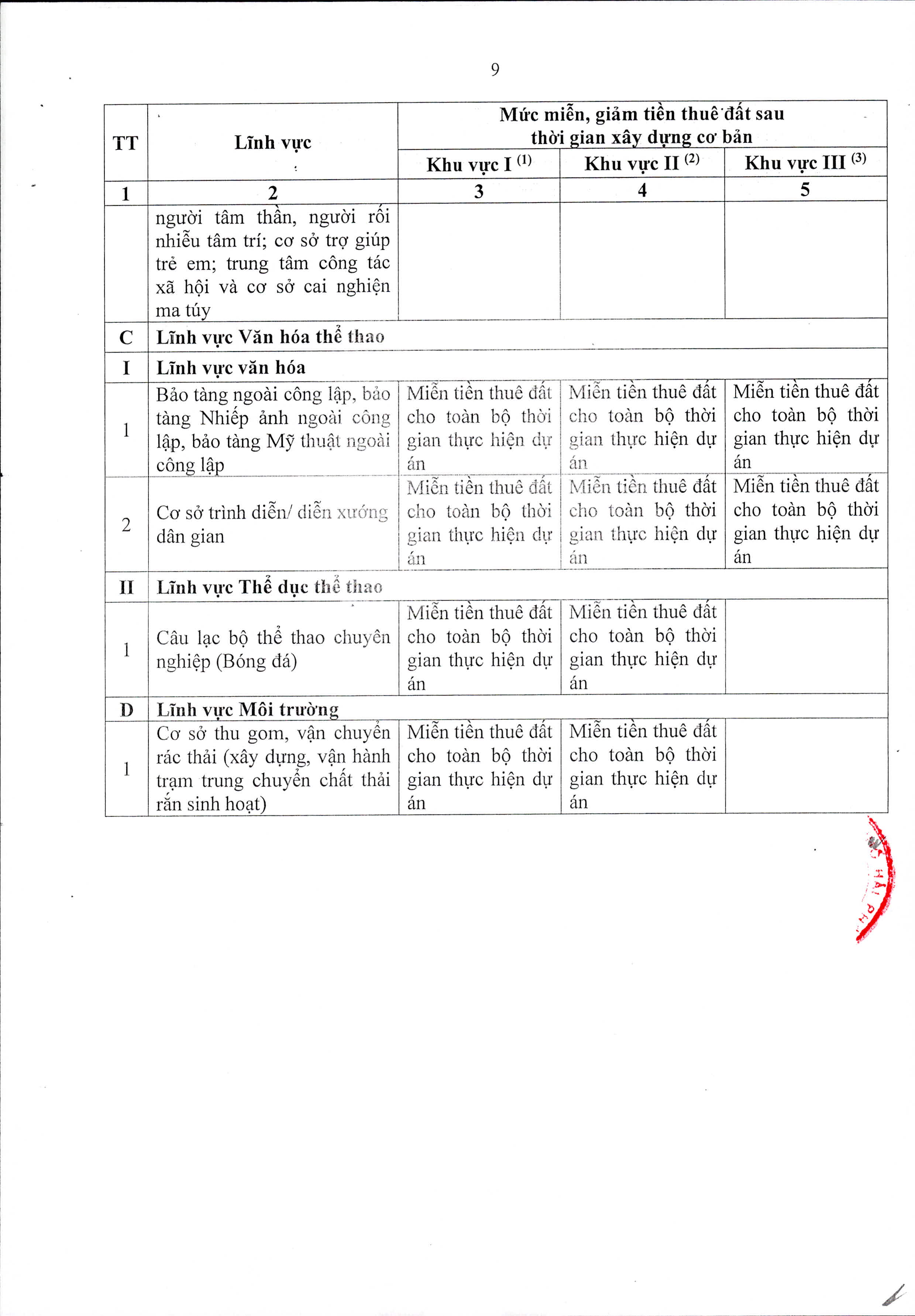 Danh mục lĩnh vực, địa bàn ưu đãi và mức miễn, giảm tiền thuê đất: Danh mục lĩnh vực, địa bàn ưu đãi xã hội hóa và mức miễn, giảm tiền thuê đất đối với cơ sở thực hiện xã hội hóa sử dụng đất tại các đô thị trên địa bàn thành phố: Chi tiết tại Phụ lục kèm theo Quyết định.