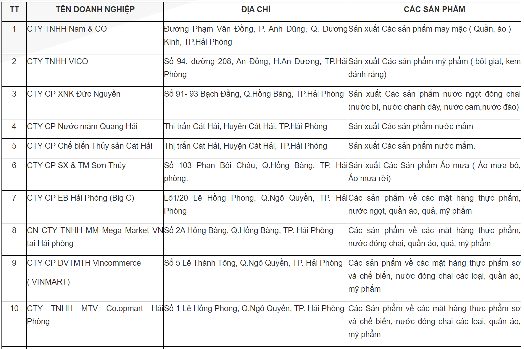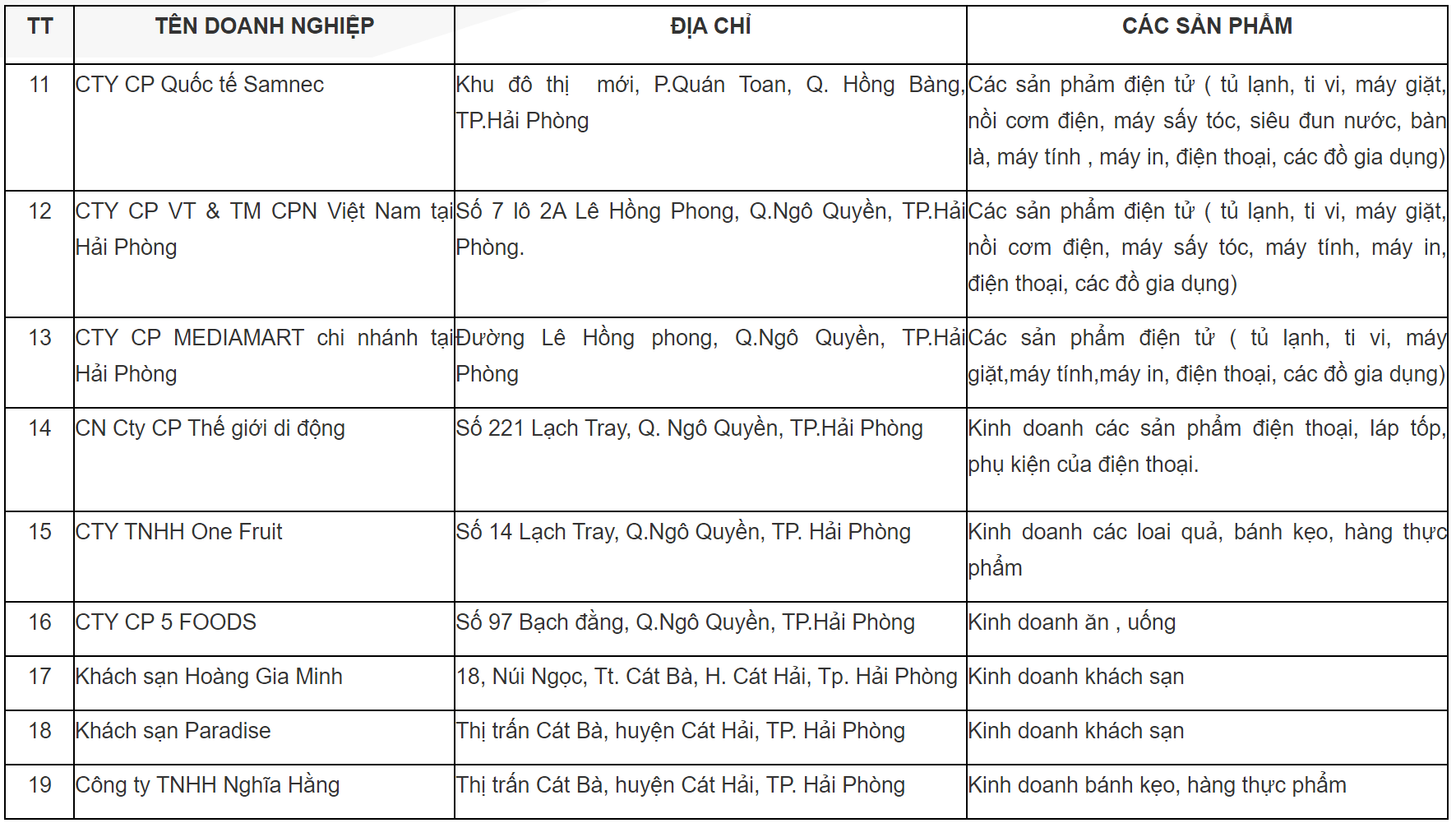 Sau đây là danh sách một số doanh nghiệp dự kiến đăng ký tham gia Điểm vàng Tháng khuyến mại Hải Phòng năm 2020: