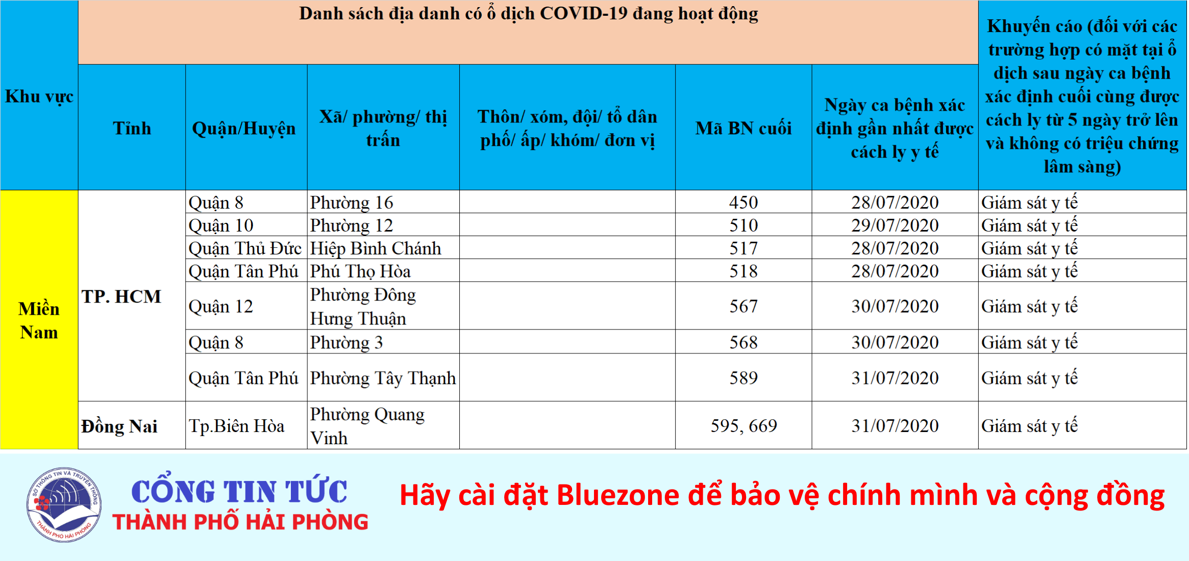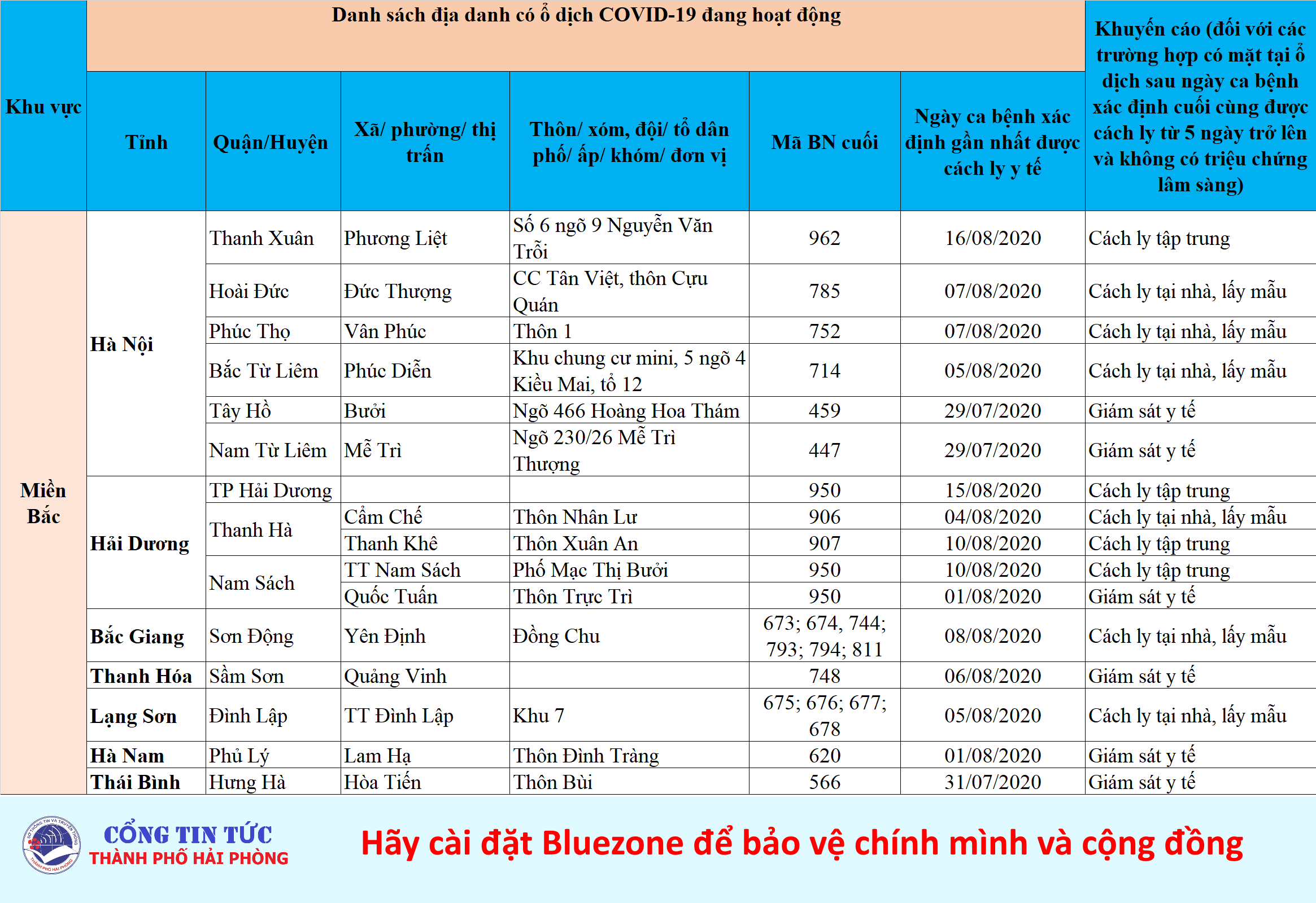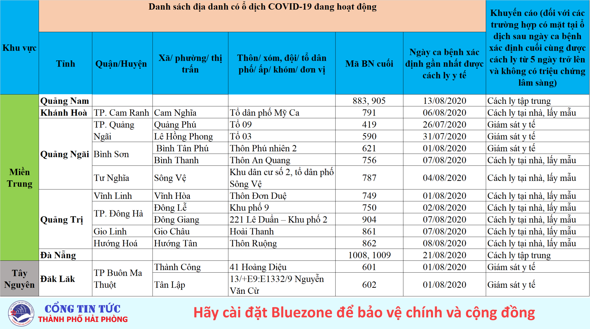 Sở Y tế thành phố Hải Phòng cung cấp Danh sách địa phương có ổ dịch COVID-19 tại Việt Nam, tính đến 21h ngày 22/8/2020.