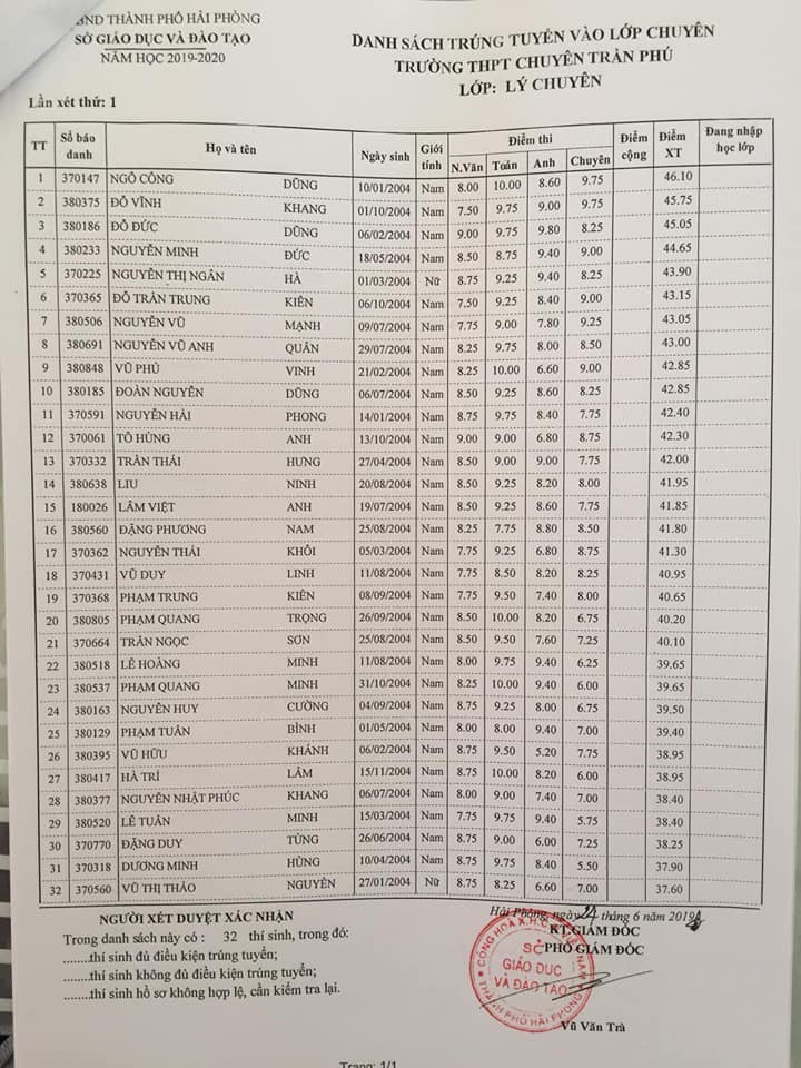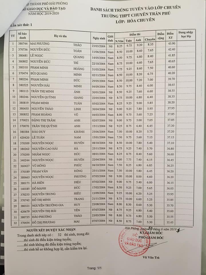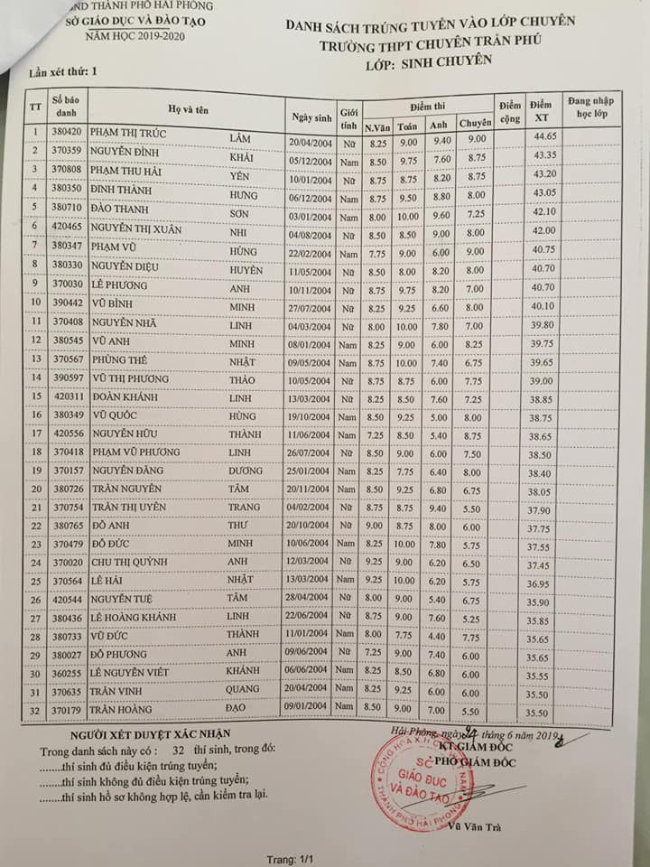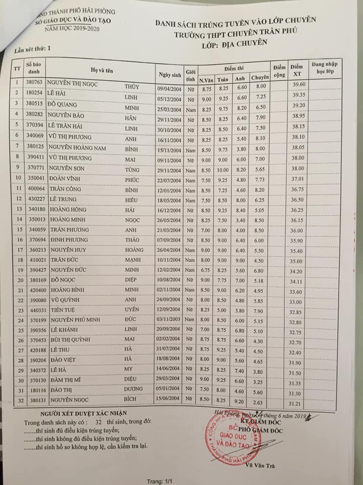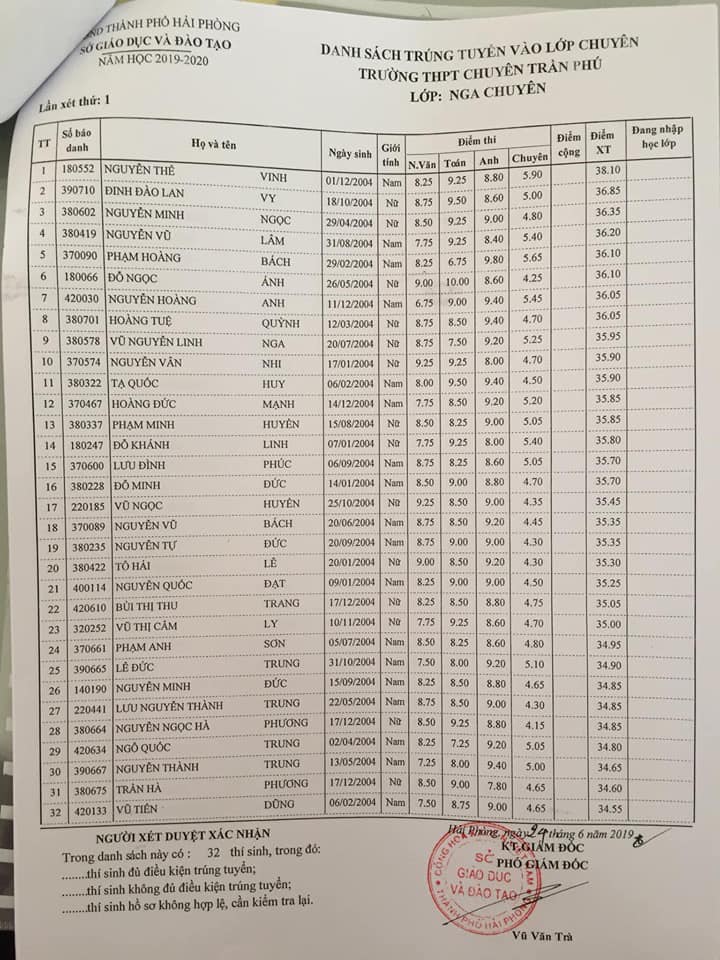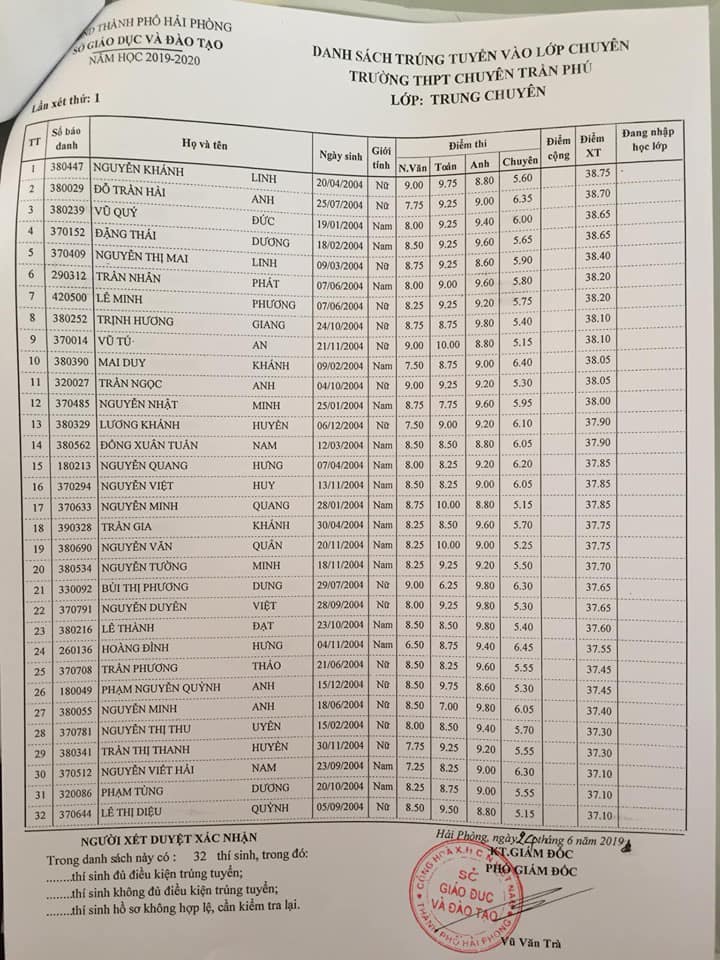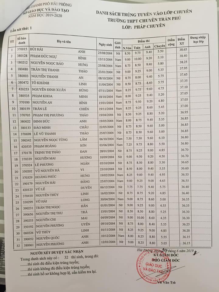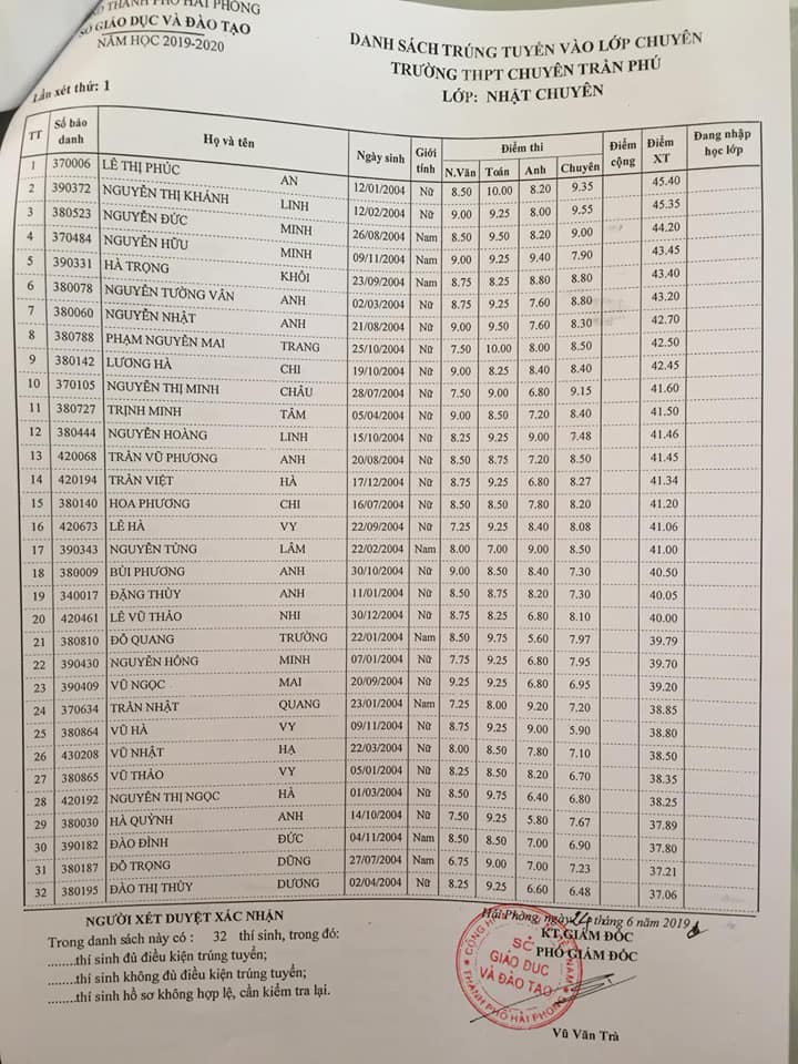 Ngày 24/6/2019, Sở Giáo dục và Đào tạo thành phố Hải Phòng đã công bố Danh sách trúng tuyển vào lớp chuyên Trường THPT chuyên Trần Phú, cụ thể như sau: