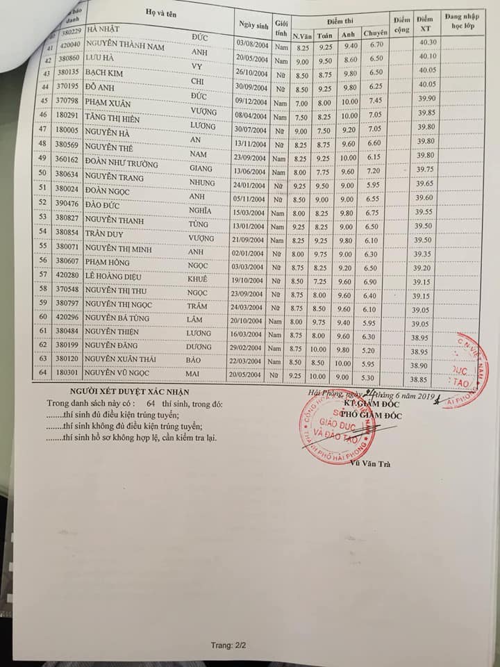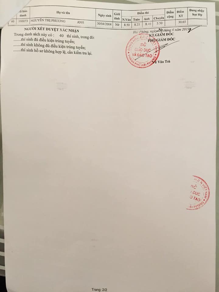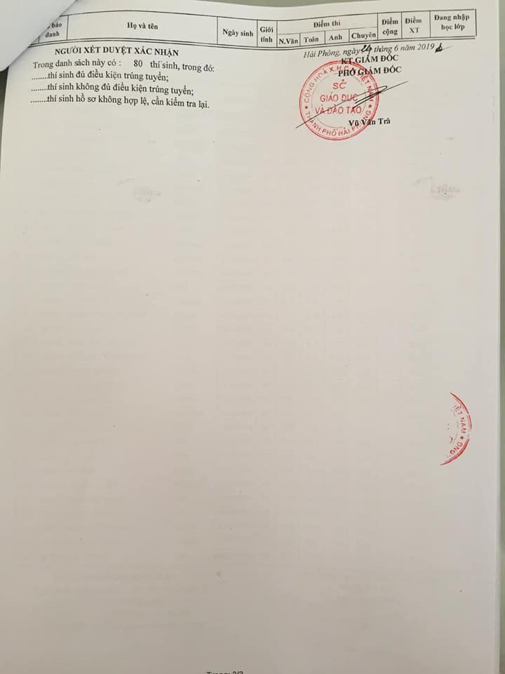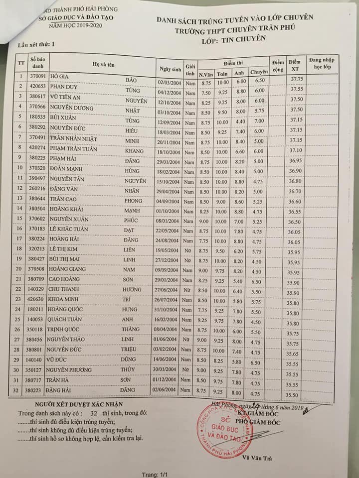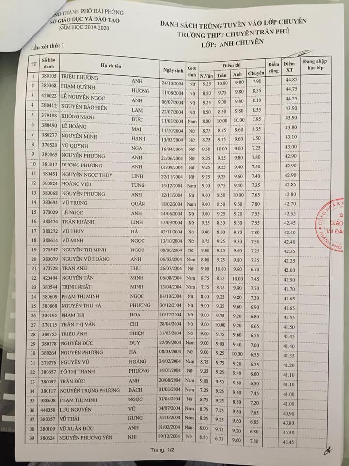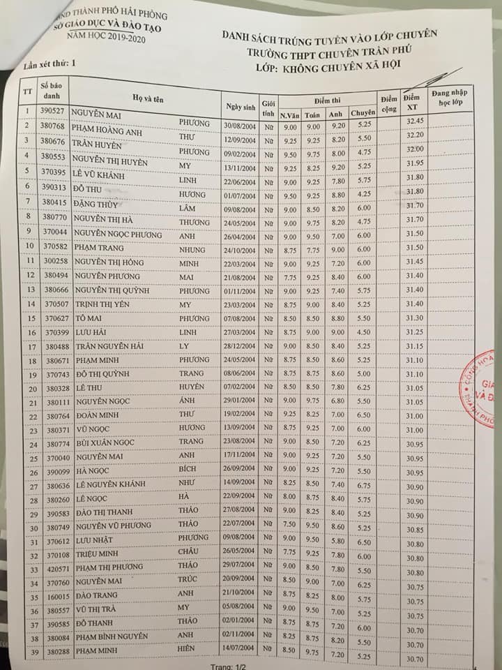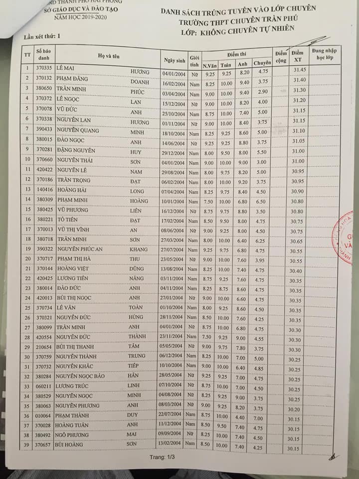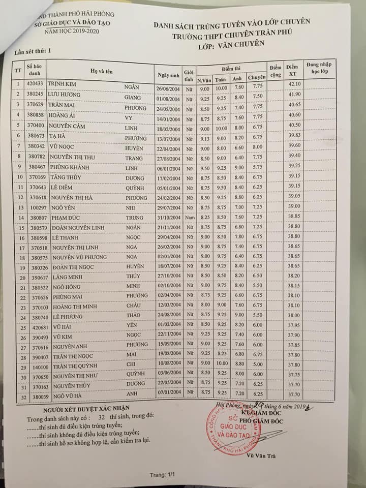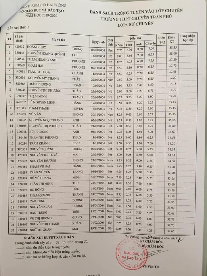 Ngày 24/6/2019, Sở Giáo dục và Đào tạo thành phố Hải Phòng đã công bố Danh sách trúng tuyển vào lớp chuyên Trường THPT chuyên Trần Phú, cụ thể như sau: