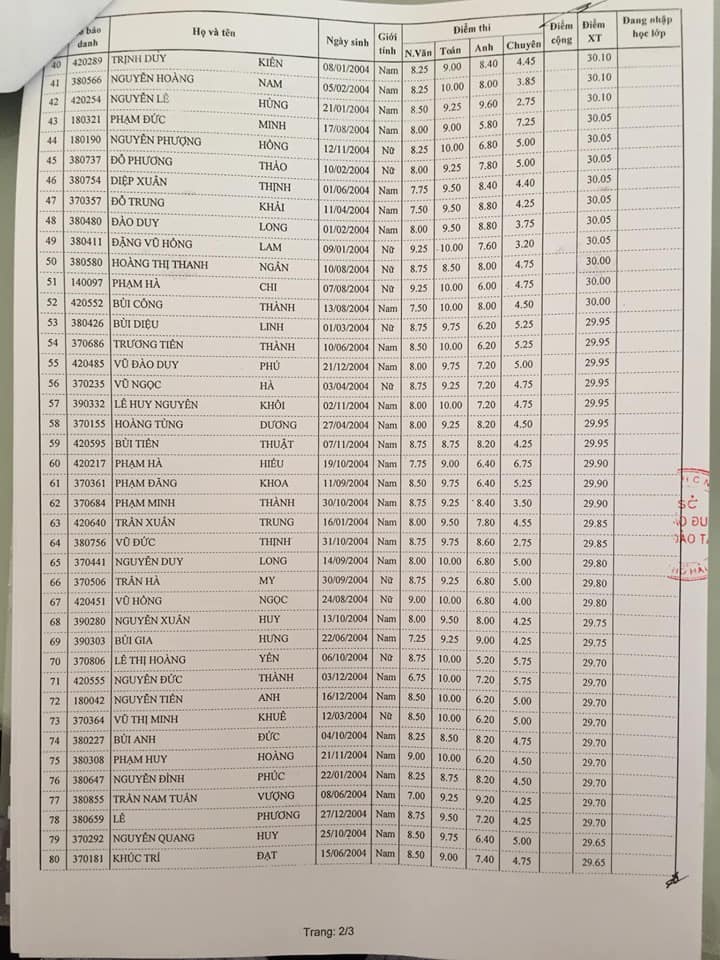 Danh sách trúng tuyển vào lớp chuyên Trường THPT chuyên Trần Phú