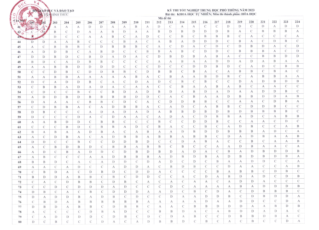 Dưới đây là đáp án chính thức môn Hoá, kì thi tốt nghiệp THPT năm 2023.
