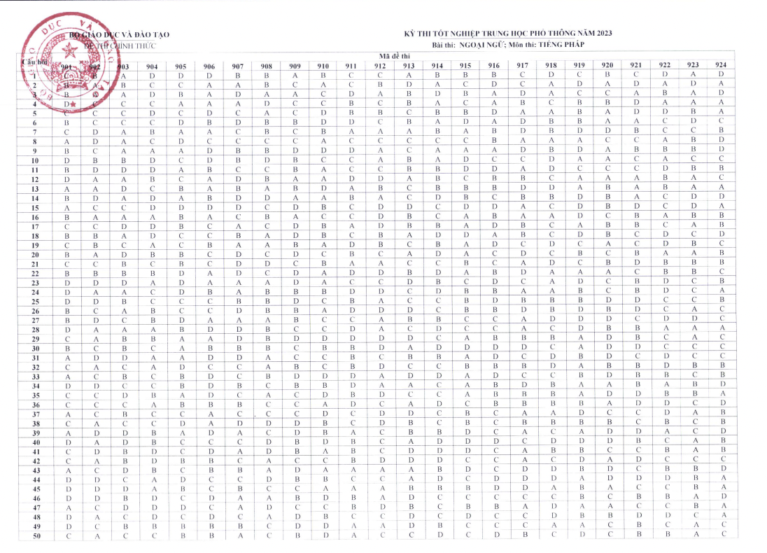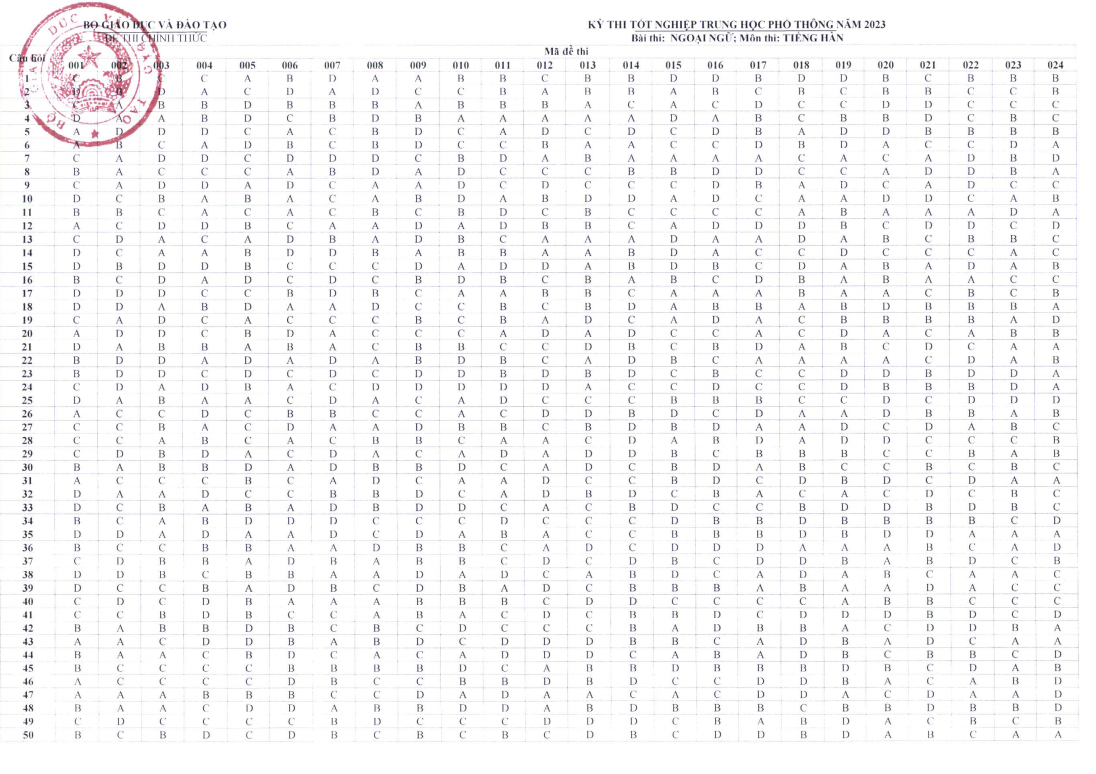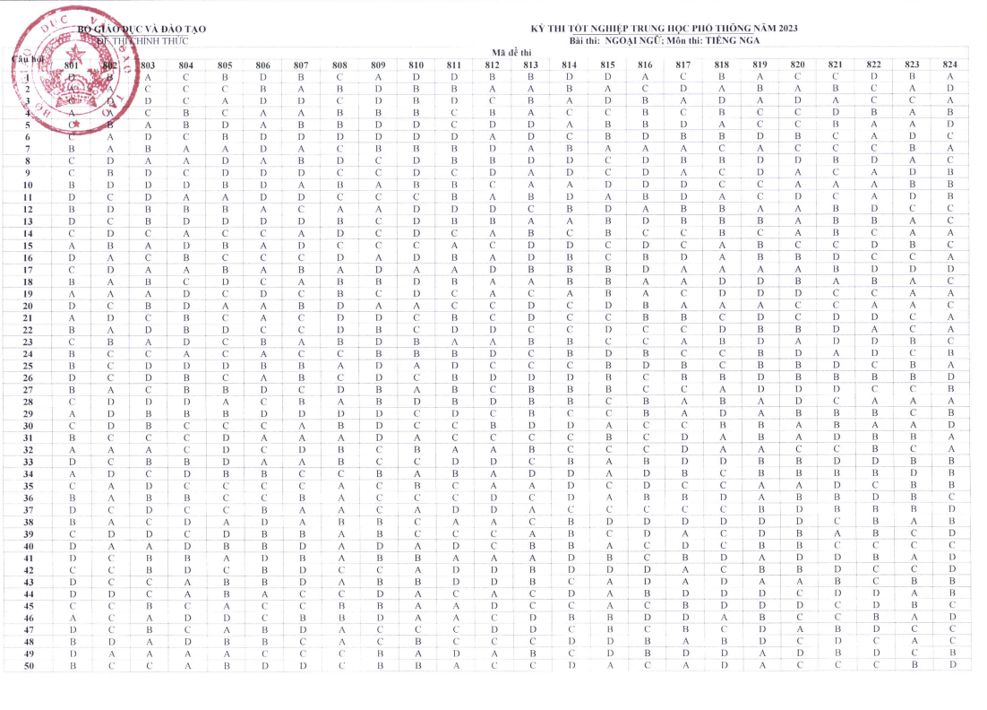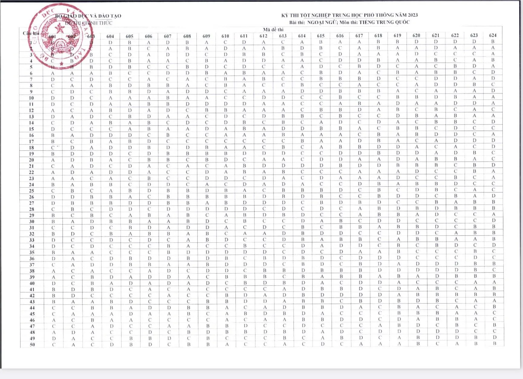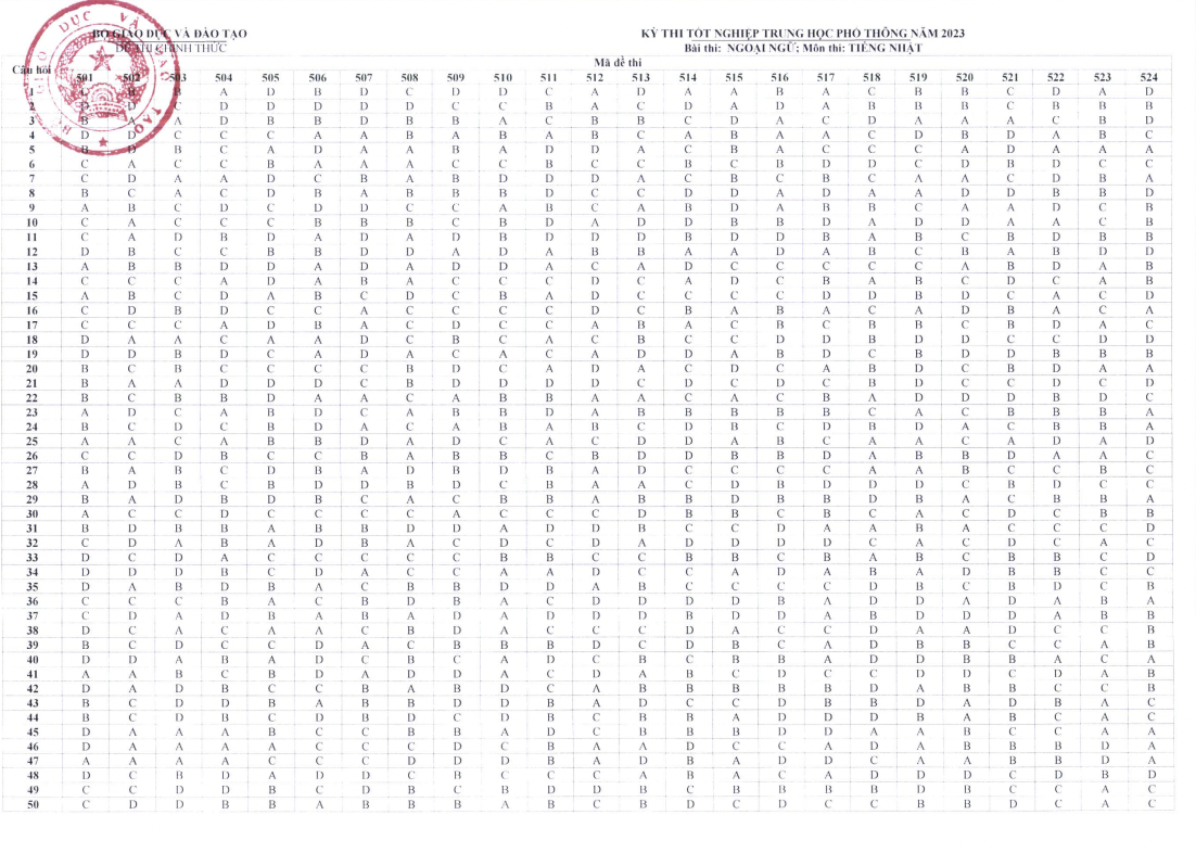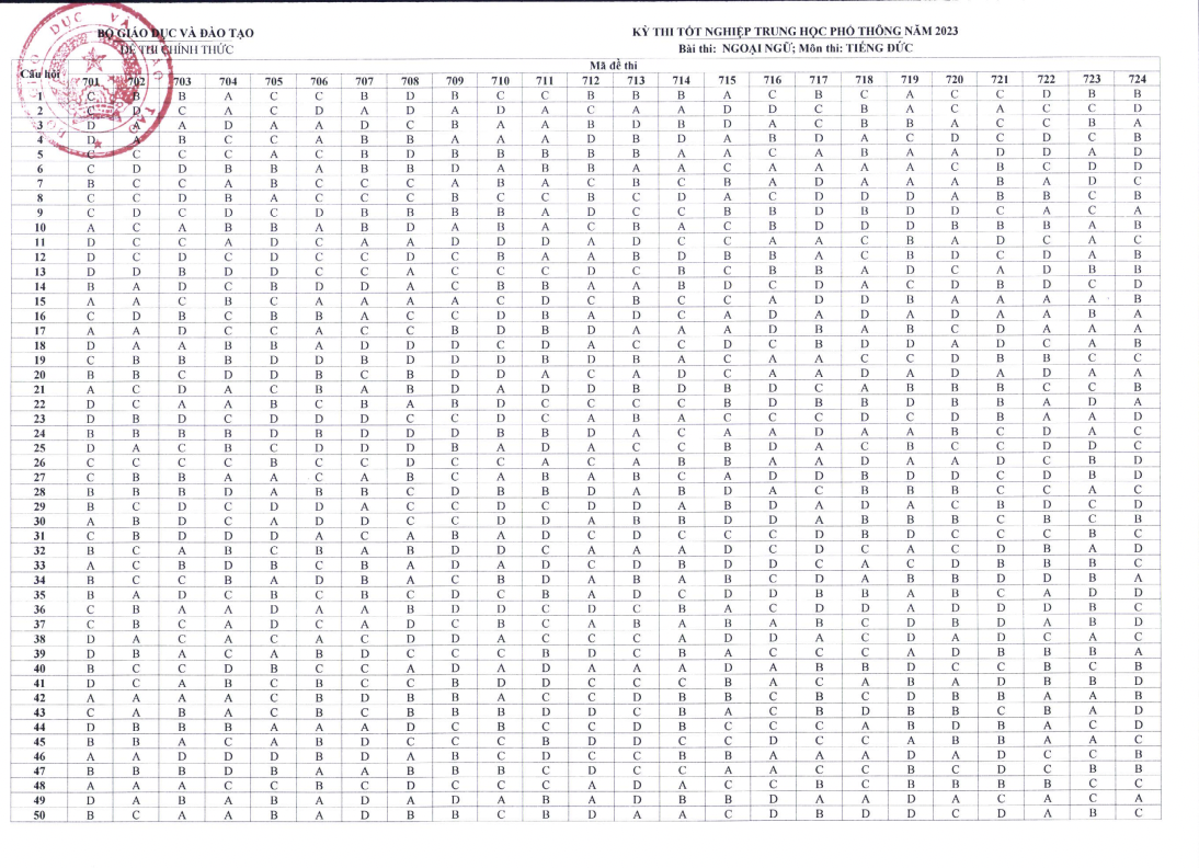 Dưới đây là đáp án chính thức môn Ngoại ngữ, kì thi tốt nghiệp THPT năm 2023 do Bộ Giáo dục và Đào tạo (GDĐT) công bố.