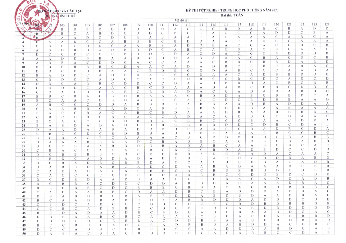 Đề thi gồm 50 câu trắc nghiệm, 24 mã đề thi. Thí sinh tra cứu đáp án chính thức theo bảng dưới đây: