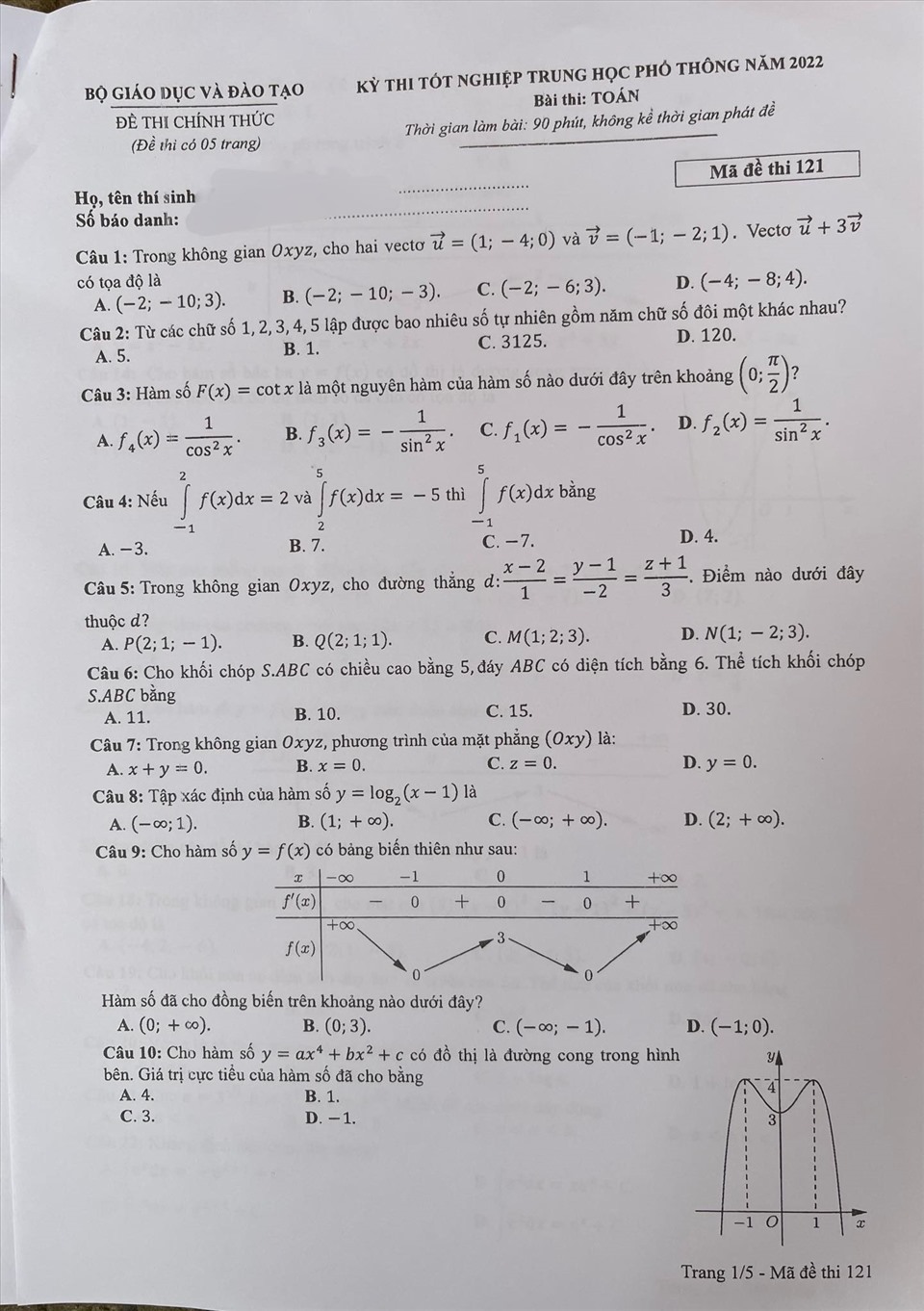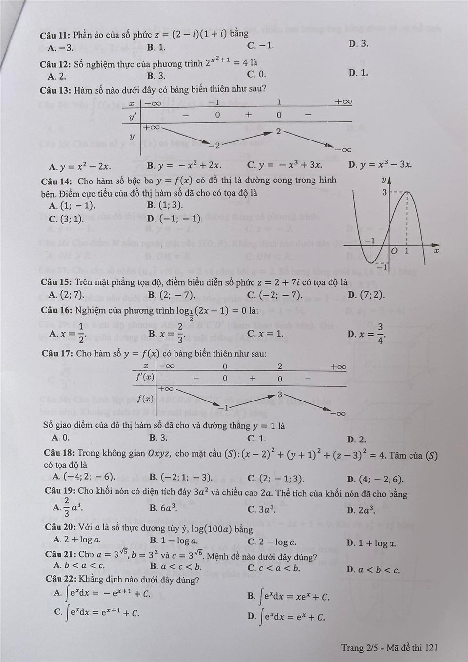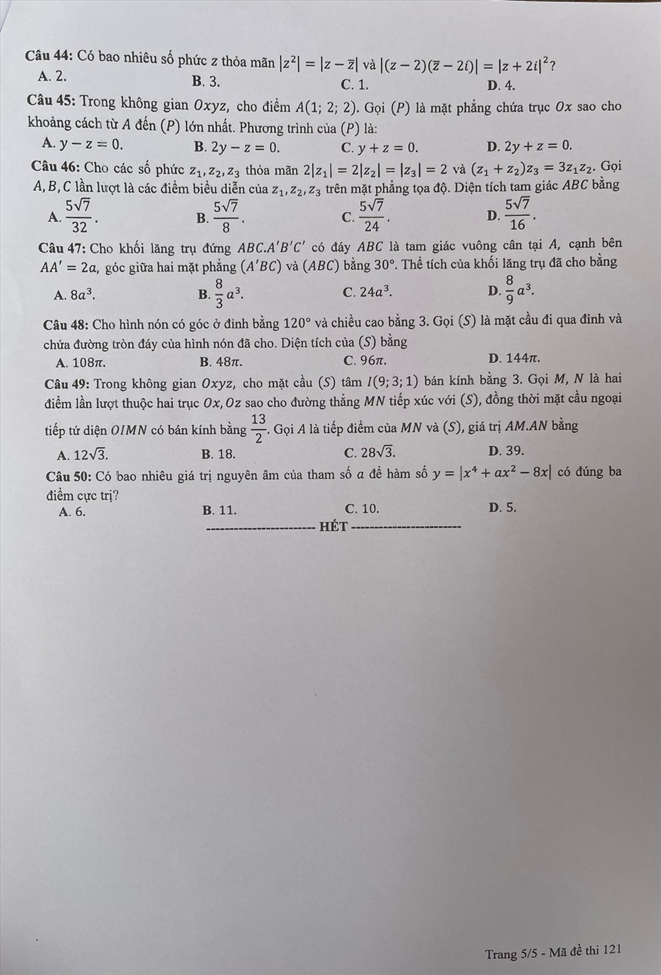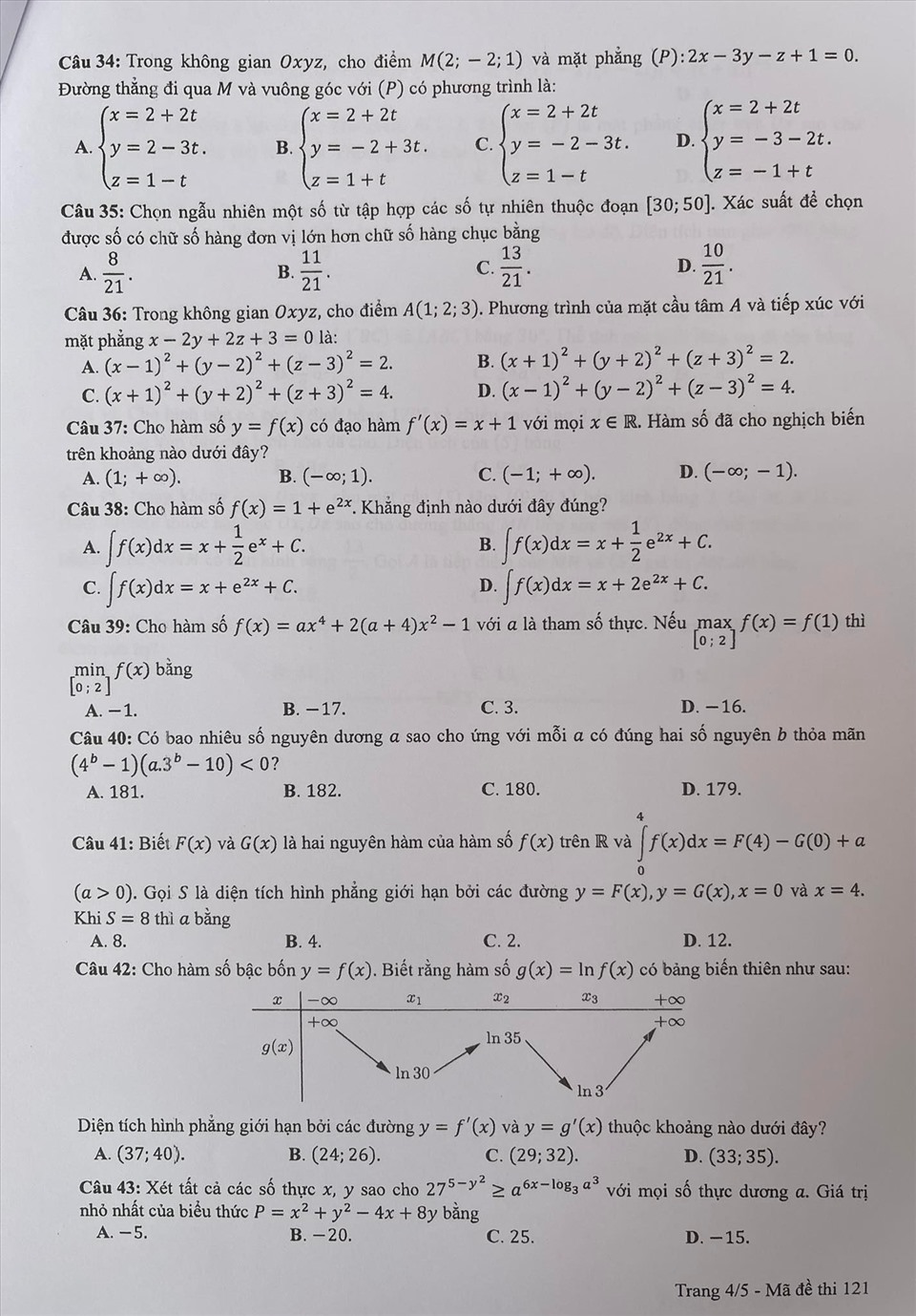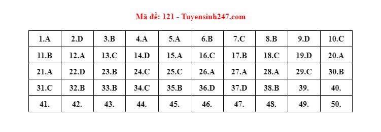 . Gợi ý đáp án môn Toán mã đề 121