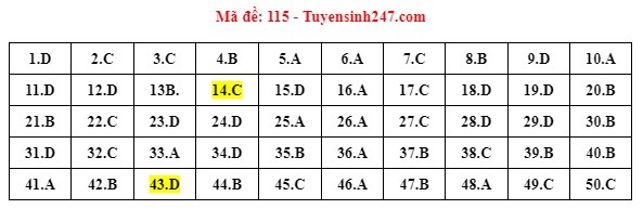 . Gợi ý đáp án môn Toán mã đề 115