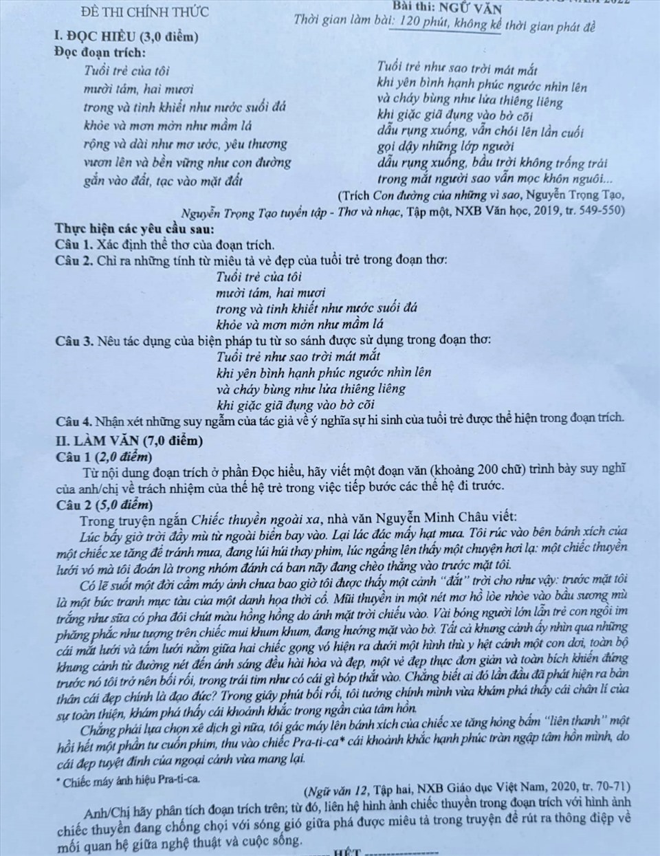 Dưới đây là đề thi và gợi ý đáp án môn Ngữ văn được Lao Động cập nhật để thí sinh tham khảo:
