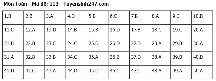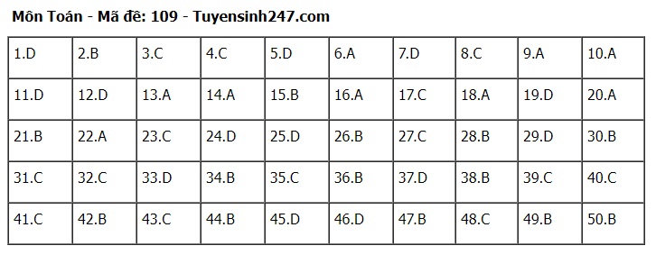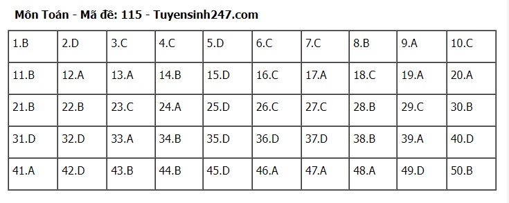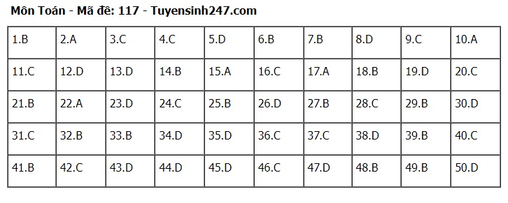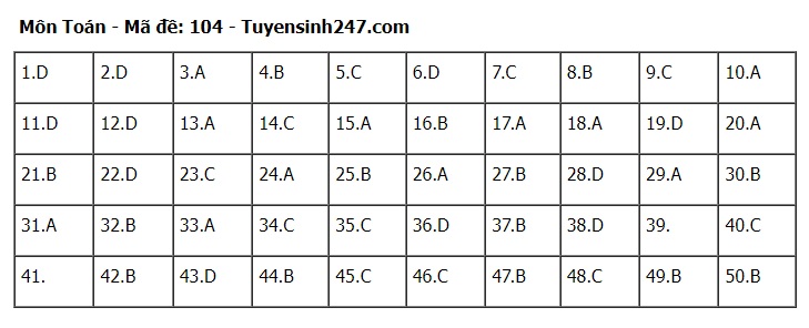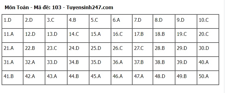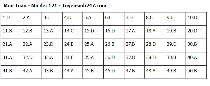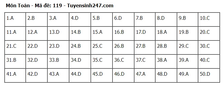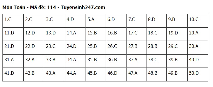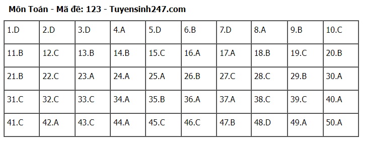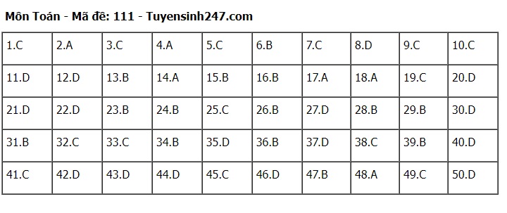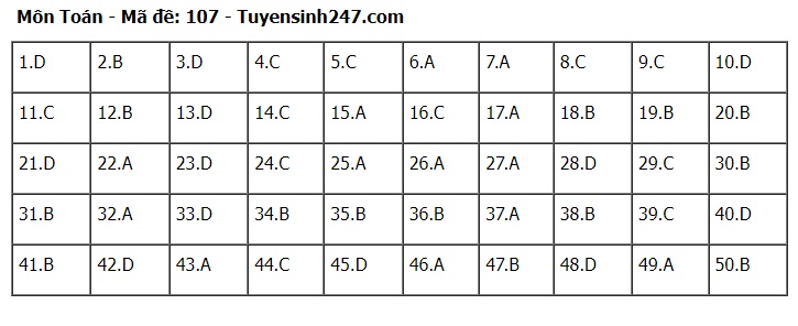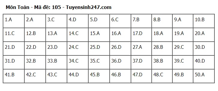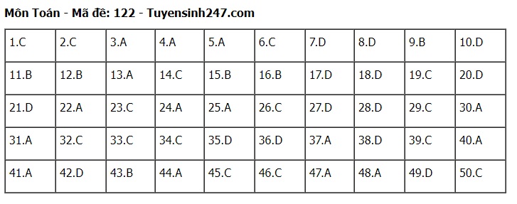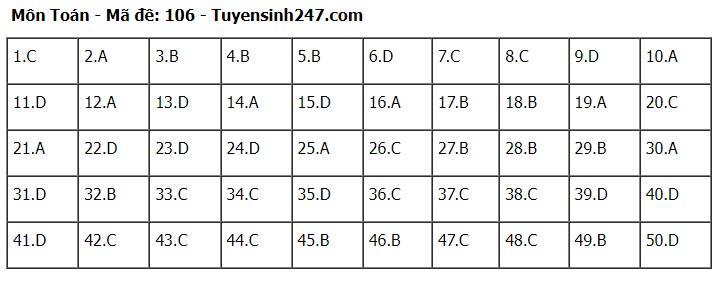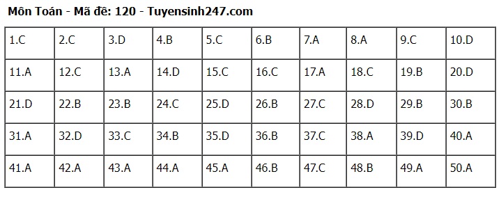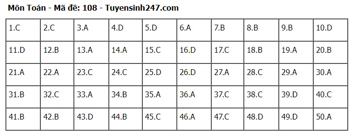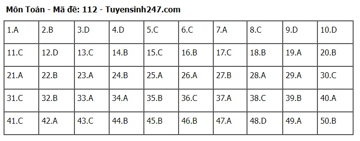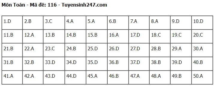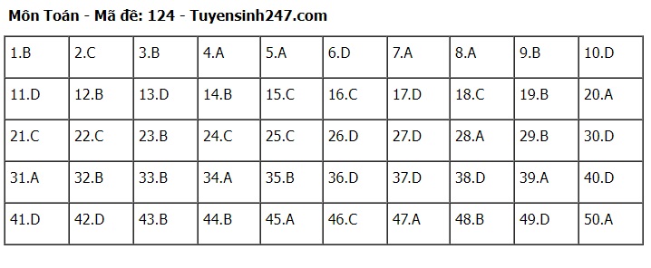 Đáp án đề Toán THPT 2024 tất cả các mã đề: 101, 102, 103, 104, 105, 106, 107, 108, 109, 110, 111, 112, 113, 114, 115, 116, 117, 118, 119, 120, 121, 122, 123, 124.